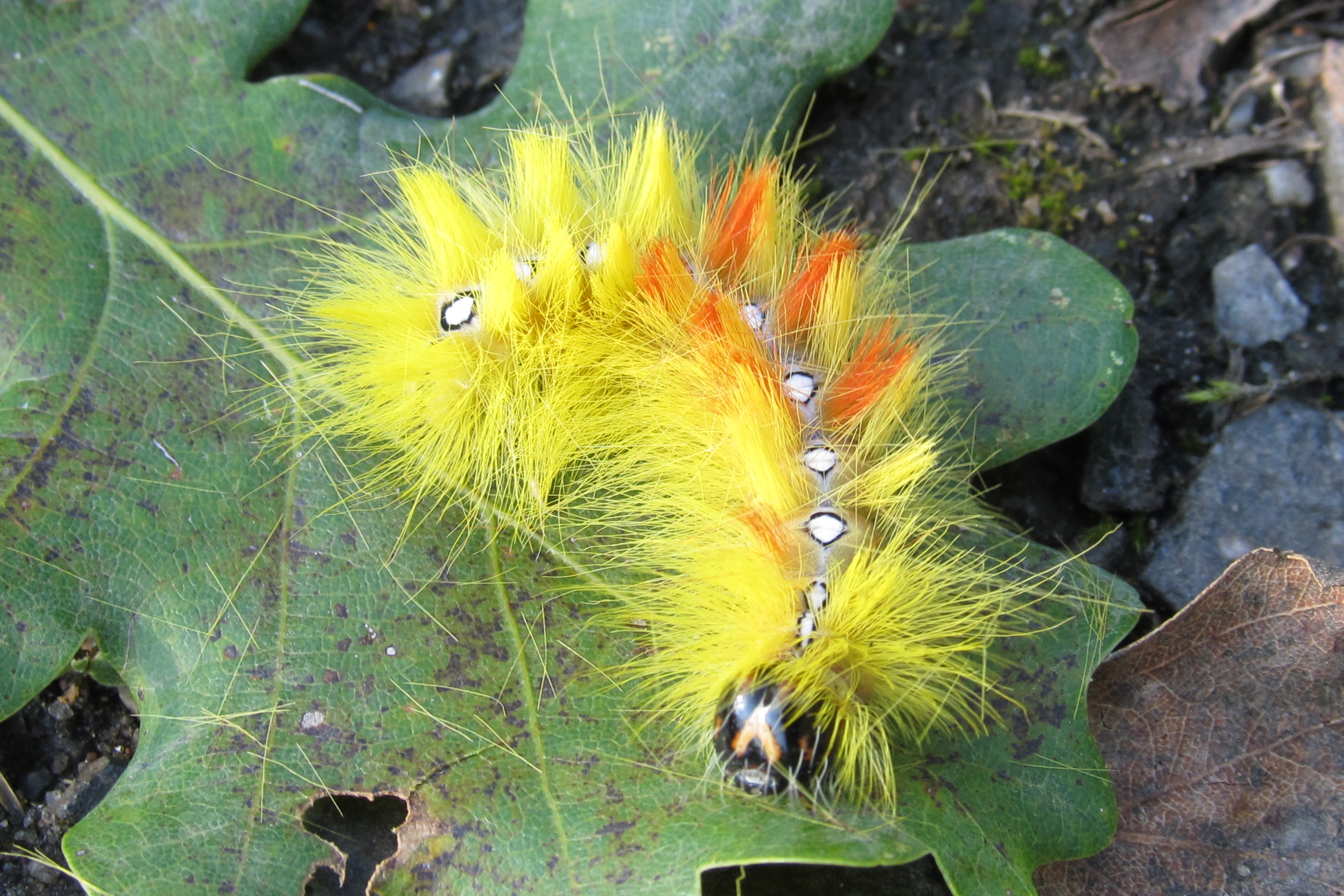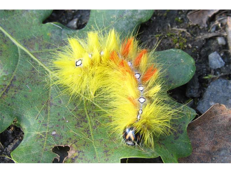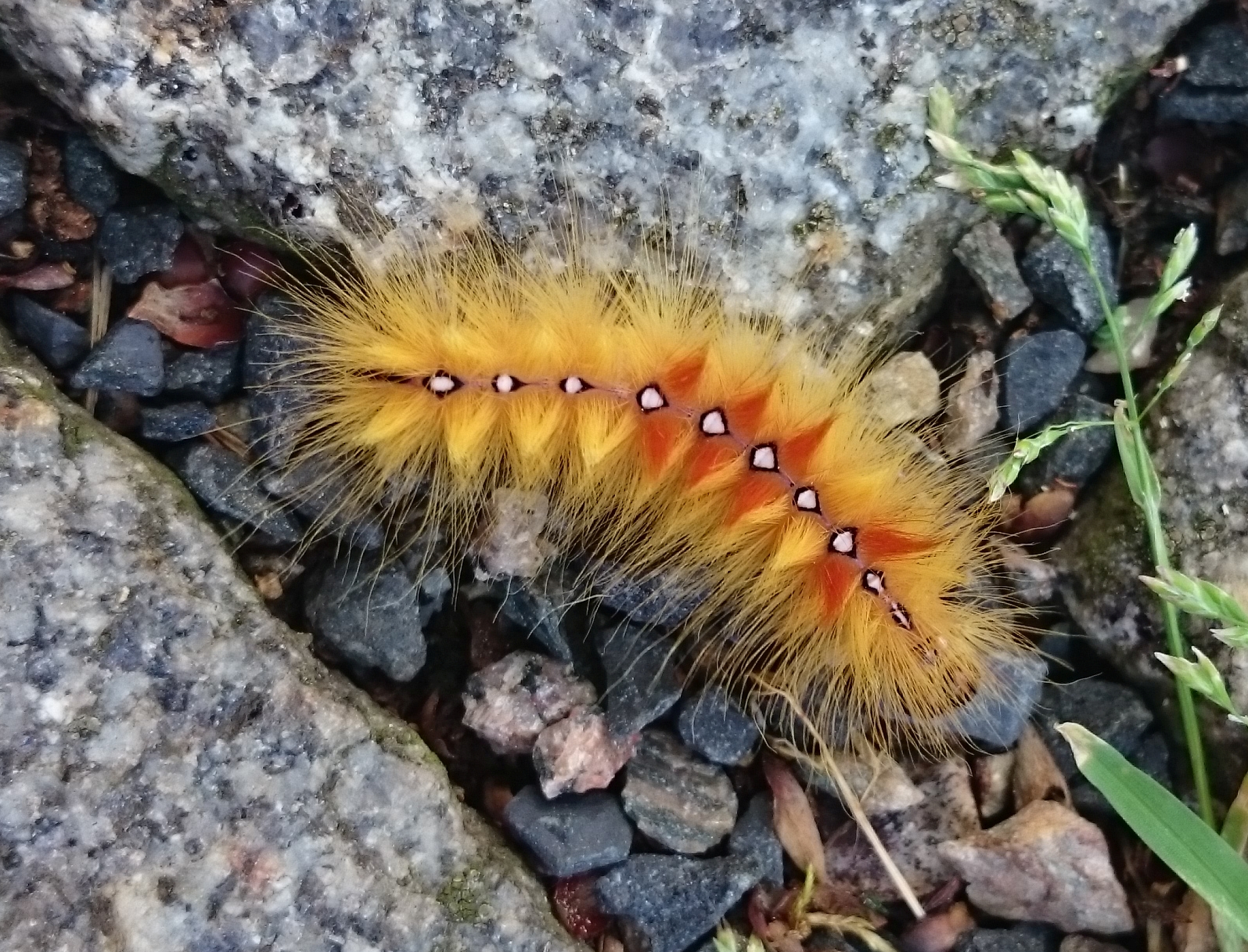 Die Art wird häufiger anhand ihrer auffällig gelb bis orange beborsteten Larve nachgewiesen, die auf dem Rücken weiße, schwarz umrandete Punkte sowie vier intensiv orangene Borstenbüschel aufweist.