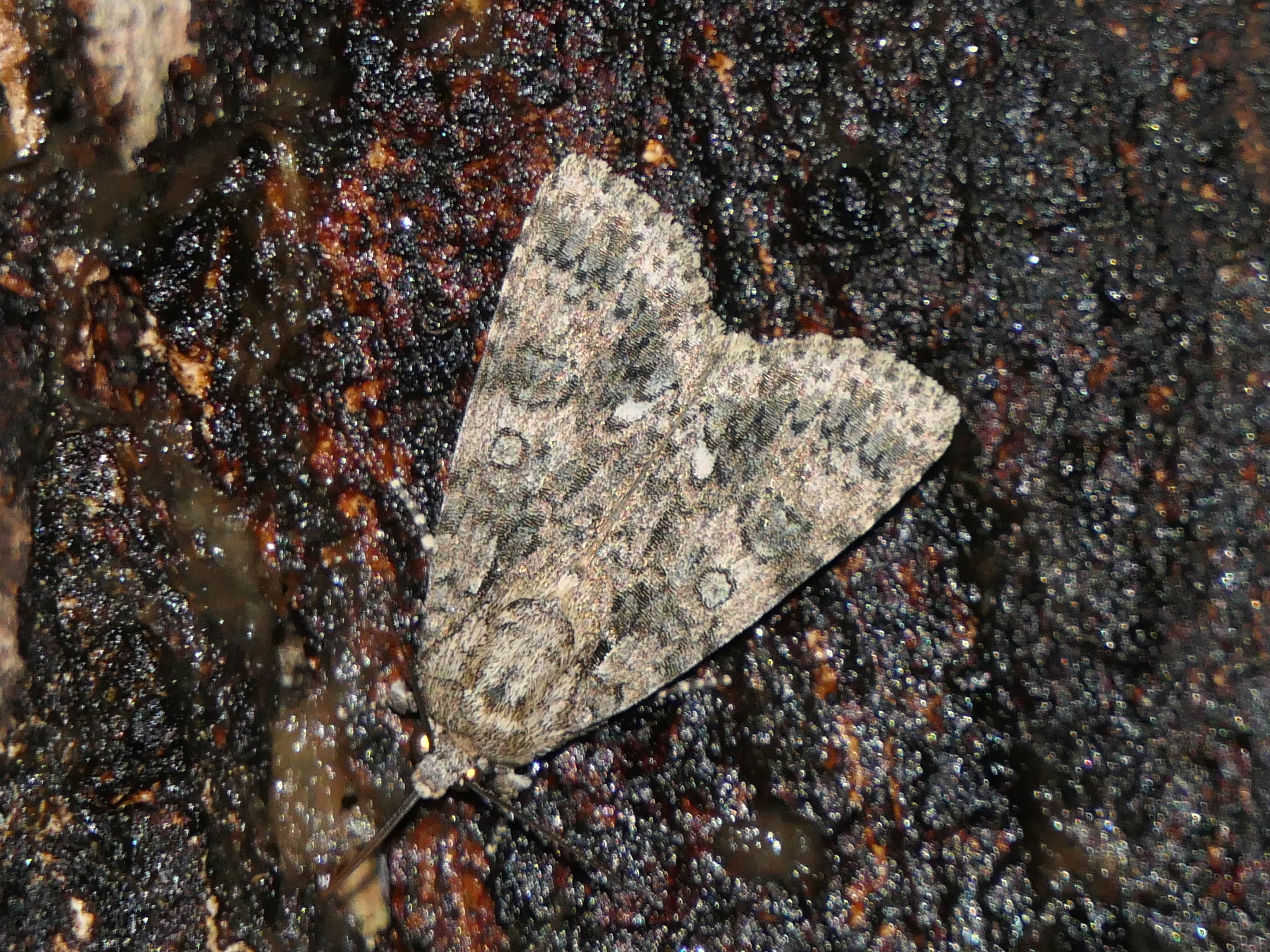Vorderflügel: Grundfarbe von grau über dunkelgrau, braungrau bis schwarz. Zeichnung meist kontrastarm, im Mittelfeld näher zum Vorderrand ein dunkler kleiner Kreis und im äußeren Flügeldrittel am Hinterrand ein deutlicher weißer Fleck; in der Ruhestellung liegen die beiden weißen Flecke der Flügel aneinander und ergeben das arttypische Erkennungsmerkmal.