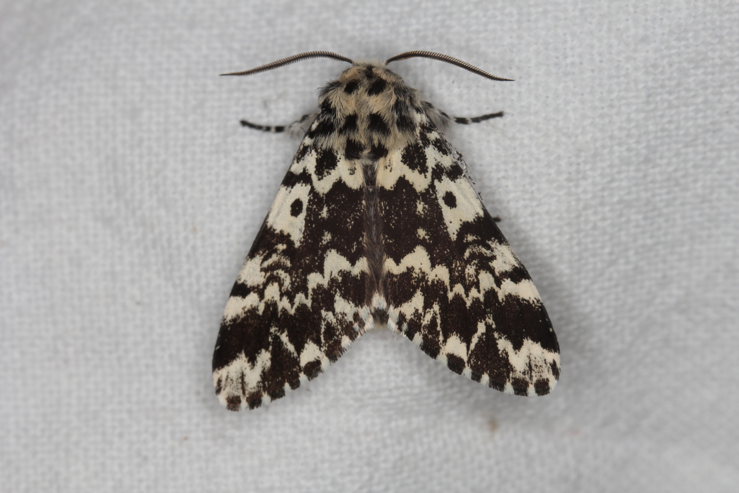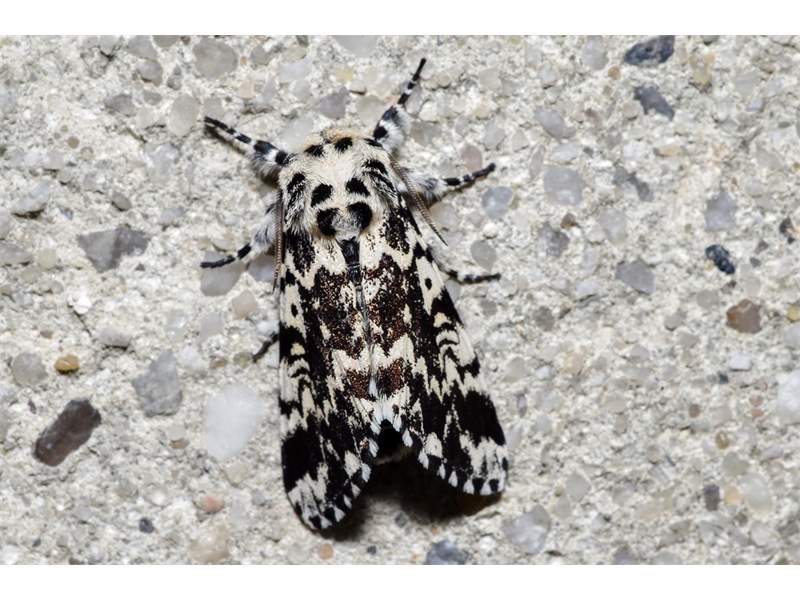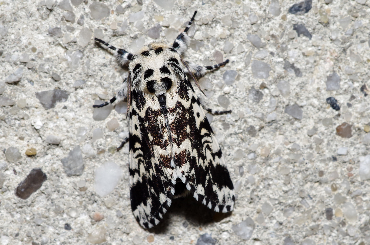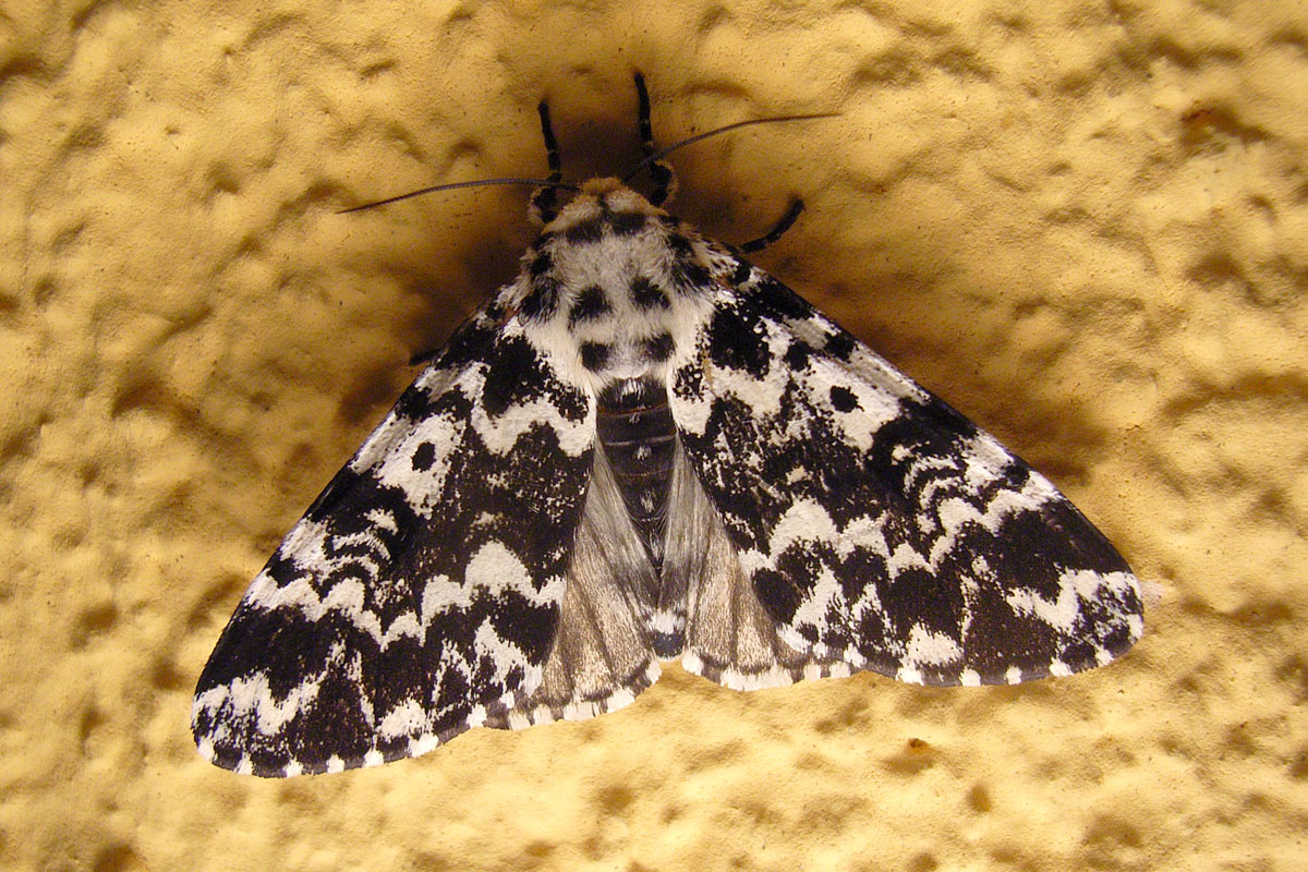 Hinterflügeloberseite: Weißgrau bis graubraun gescheckt mit einem dunklen Mittelstrich und einer schwarzweißen Strichzeichnung im Analwinkel.