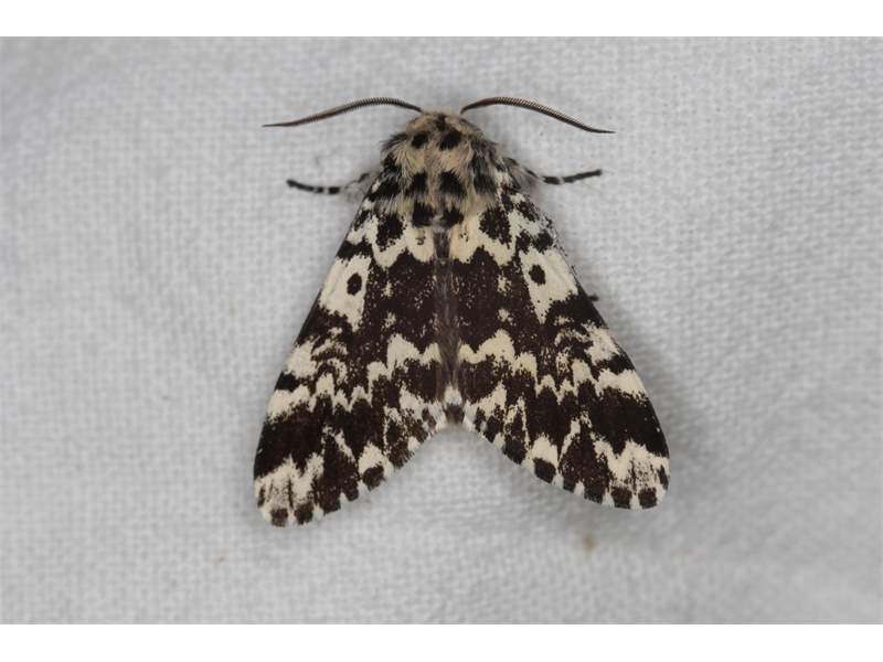 Vorderflügeloberseite: Grundfarbe weiß. Querlinien und Mittelschatten schwarz, stark gezackt und breit; sie nehmen mehr als 50% der Fläche ein; innerhalb des Mittelschattens befinden sich nahe zum Flügelvorderrand zwei weißliche Bereiche, in denen zum einen ein deutlicher schwarzer Punkt (Ringmakel) und zum anderen die schwarz gerandete und weißgekernte Nierenmakel gut zu erkennen sind.