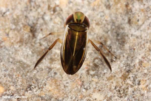 Die Art ist unter den Vertretern der ansonsten recht schwierigen Familie der Ruderwanzen ein leicht kenntlicher Vertreter. Sie ist mit 3,0 bis 4,5 mm recht klein und weist als einzige heimische Art dieser Gattung längs verlaufende dunkle Muster auf den Deckflügeln auf. Der Kopf und die Augen wirken bei dieser Art recht groß, so dass sich ein arttypischer Gesamteindruck ergibt.