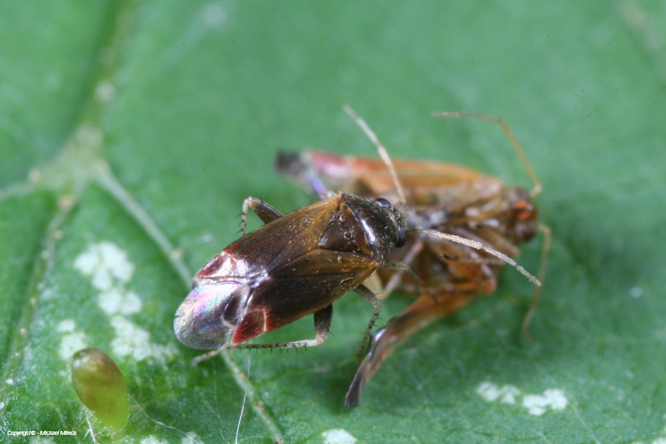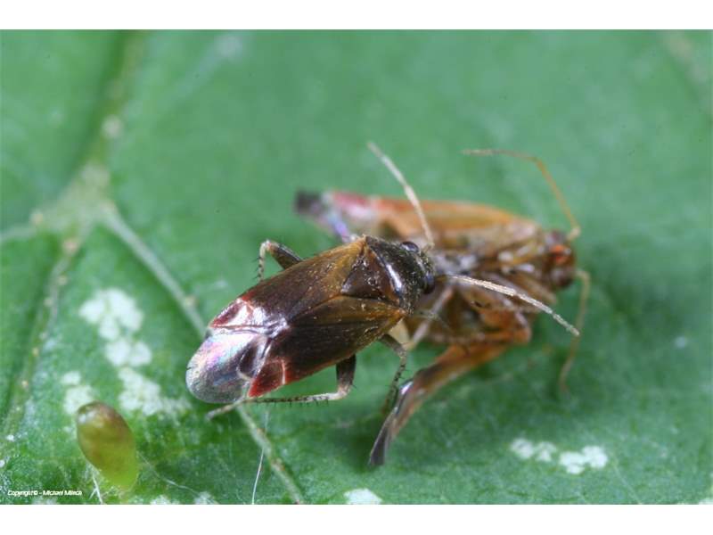 Psallus variabilis, saugt an totem Psallus cf. variabilis, Zschopauhänge südöstlich Braunsdorf (Deutschland, Sachsen, Landkreis Mittelsachsen), 02.06.2009 (© Michael Münch)( Bild vergrößern)