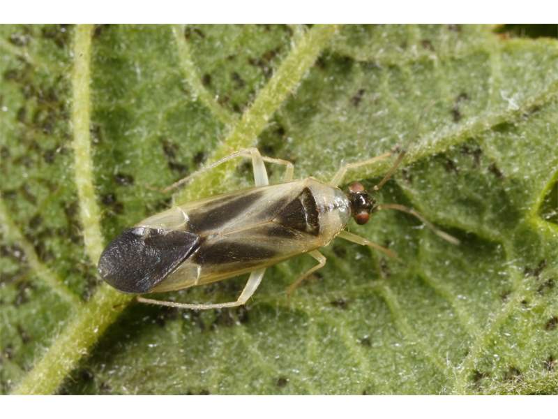 Stenotus binotatus mit zwei schwarzen Flecken auf dem Halsschild und einem größtenteils gelblichen Kopf.