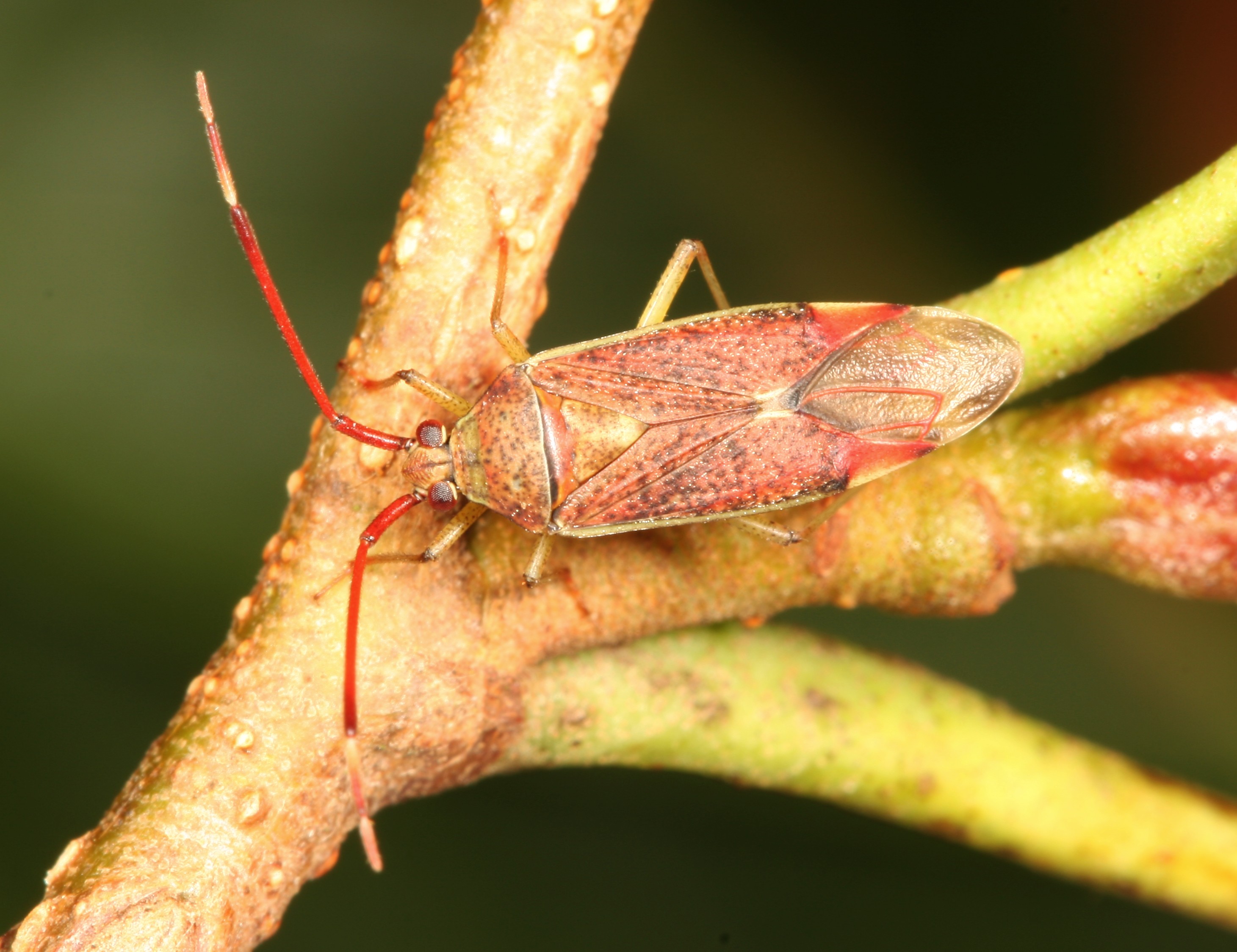 Die längliche Art fällt durch ihre mit 8,2 bis 10,5 mm für Weichwanzenverhältnisse recht üppige Körpergröße auf. Während der Körper eher fahl gelblich-grünlich gefärbt ist, variiert die Färbung der Flügeldecken von grünlich (junge Tiere) bis bräunlich (ältere Exemplare) mit dichten braun- bis purpurroten Flecken und gibt der Art ein unverwechselbares Erscheinungsbild.
