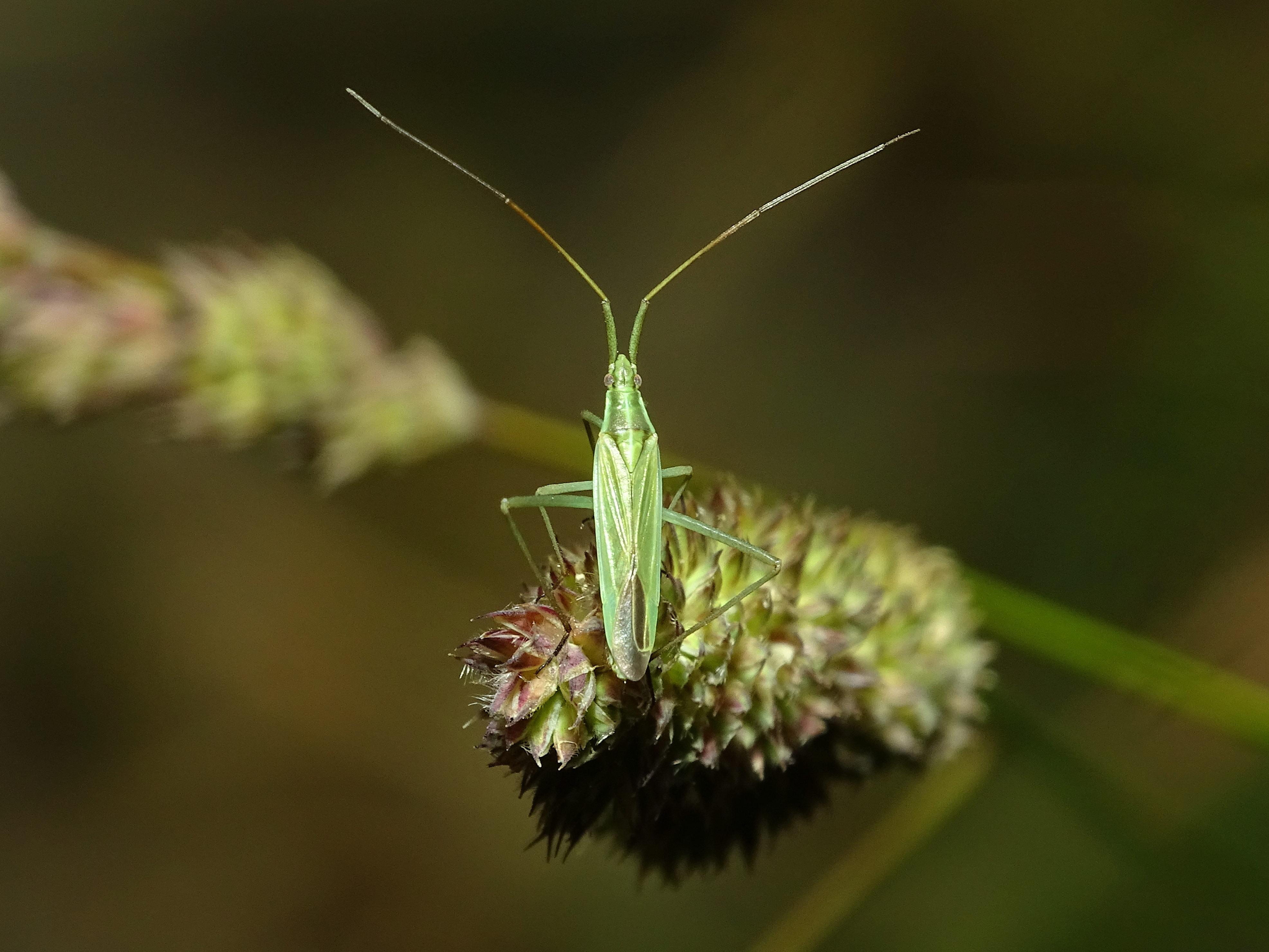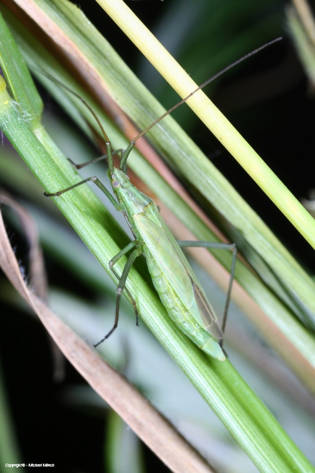 Kopf: wie der Rest des Tieres grün, Kopf mit Längsfurche, Fühler sehr lang (1,3x Körperlänge).