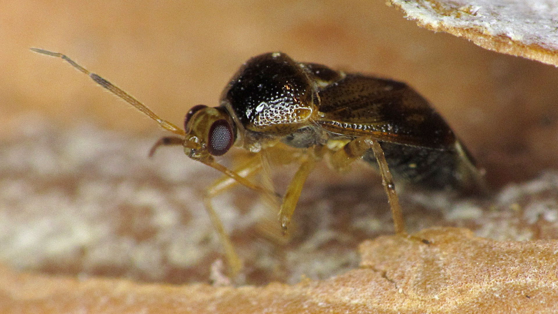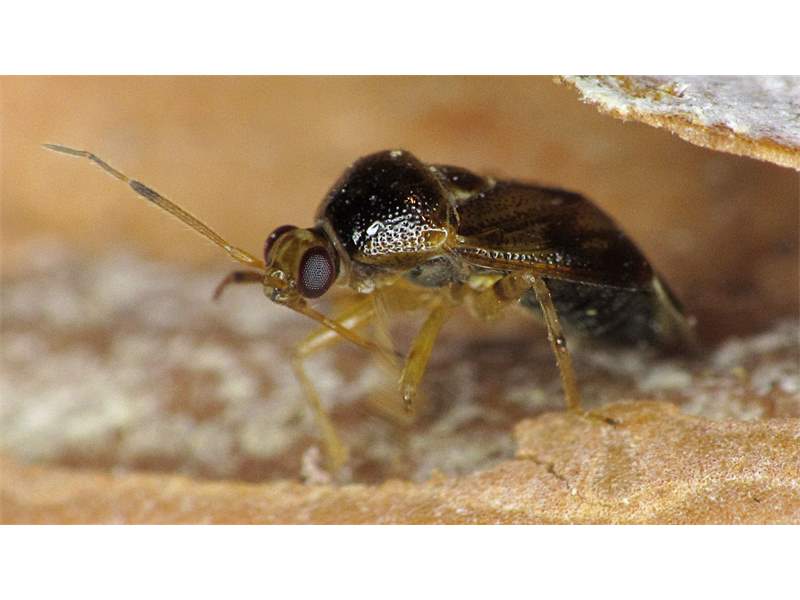Glänzende Weichwanze (Deraeocoris lutescens), im Schlosspark Püchau, unter der Borkenschuppe einer Ahornblättrigen Platane (Platanus x hispanica), Februar 2014