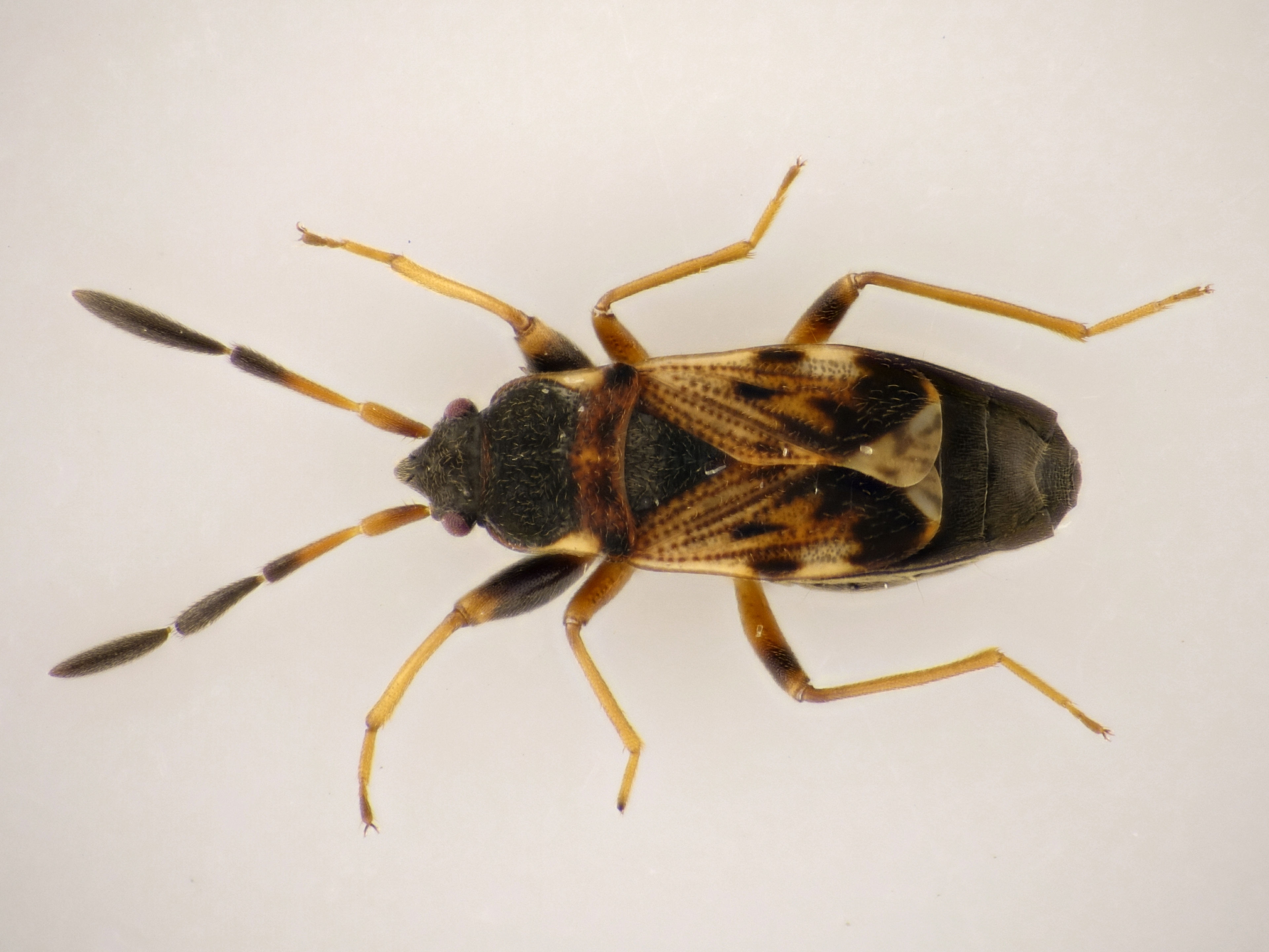 Abdomen: Schildchen schwarz, Halbdecken vorn hellbraun, dunkel punktiert, hinten schwarz mit vier weißlichen Längsflecken, meist kurzflüglig - langflüglige Exemplare deutlich seltener.