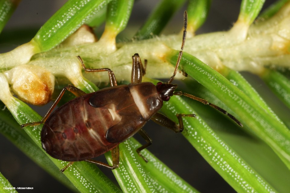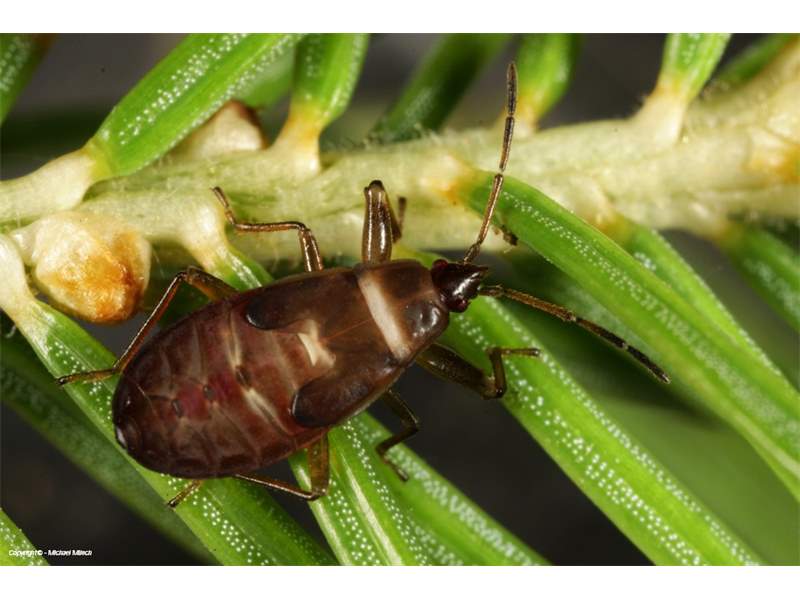 Die erwachsenen Tiere der Art leben in verholzten Fichtenzapfen, wo die Samen besaugt werden. Auch die Überwinterung erfolgt im nicht zu trockenen aber auch nicht zu nassen Fichtenzapfen, auch wenn diese vom Baum heruntergefallen sind bleiben die Tiere im Zapfen. Nach der Überwinterung sind umherfliegende Tiere im Frühjahr oft auch in der Vegetation an Waldrändern zu finden. Die Larven erscheinen dann im Sommer und halten sich an den Zweigen der Bäume auf, wo auch Nadeln besaugt werden. Erwachsene Tiere sind wieder ab Ende Juli / August anzutreffen.