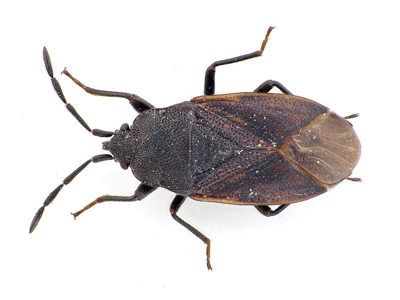 Thorax: Halsschild vorn nur wenig schmaler als am Hinterrand, wie das Schildchen schwarz. Beine ohne lange abstehende Haare. Halbdecken dunkelbraun gefärbt, in der Mitte am breitesten.