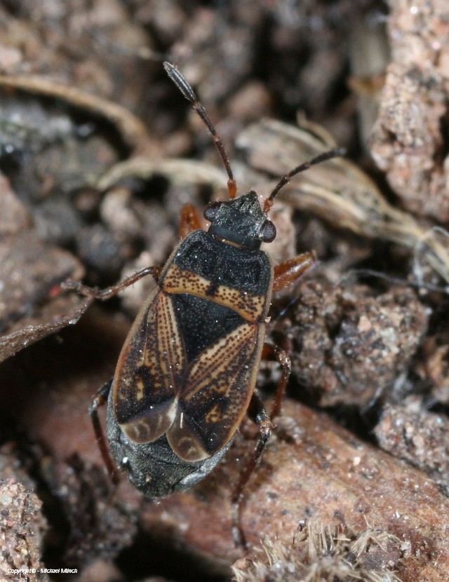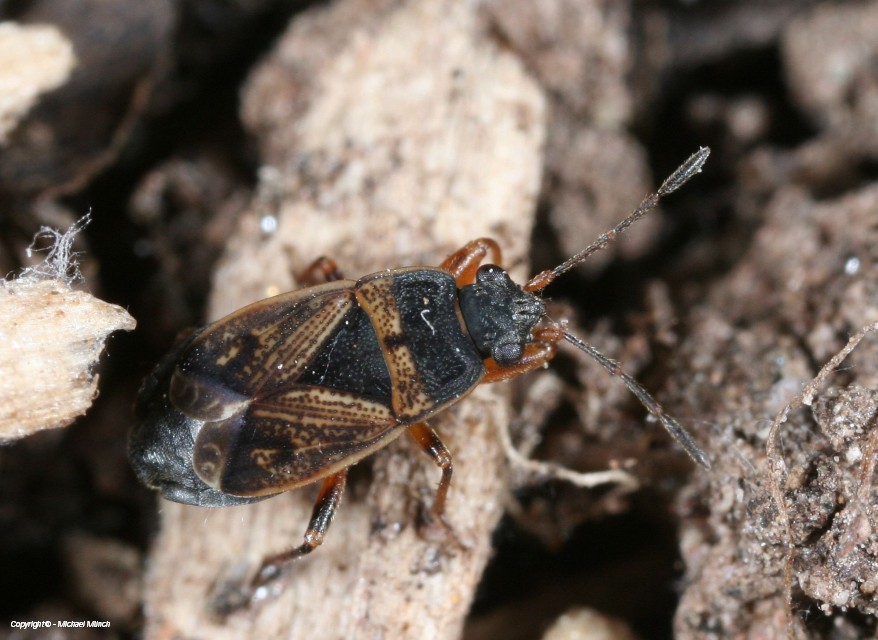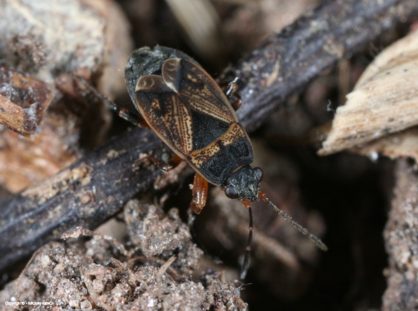Thorax: Schmaler Seitenrand und hinterer Abschnitt des ansonsten schwarzen Halsschildes, sowie die meist voll entwickelten Halbdecken hellbraun mit dunklen Punkten. Punkte auf den Halbdecken in Reihen angeordnet. Im Bereich der Innenwinkel der Halbdecken ein rautenförmiger schwarzer Fleck. Membran schwarz, mit hellen Adern. Vorderschenkel gezähnt. Schenkel beim Männchen alle wenigstens zum Teil gelbrot, z.T. an der Basis schwarz. Hinterschienen bei beiden Geschlechtern hell. Das erste Glied der Hintertarsen kürzer als das 2. und 3. zusammen.
