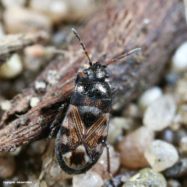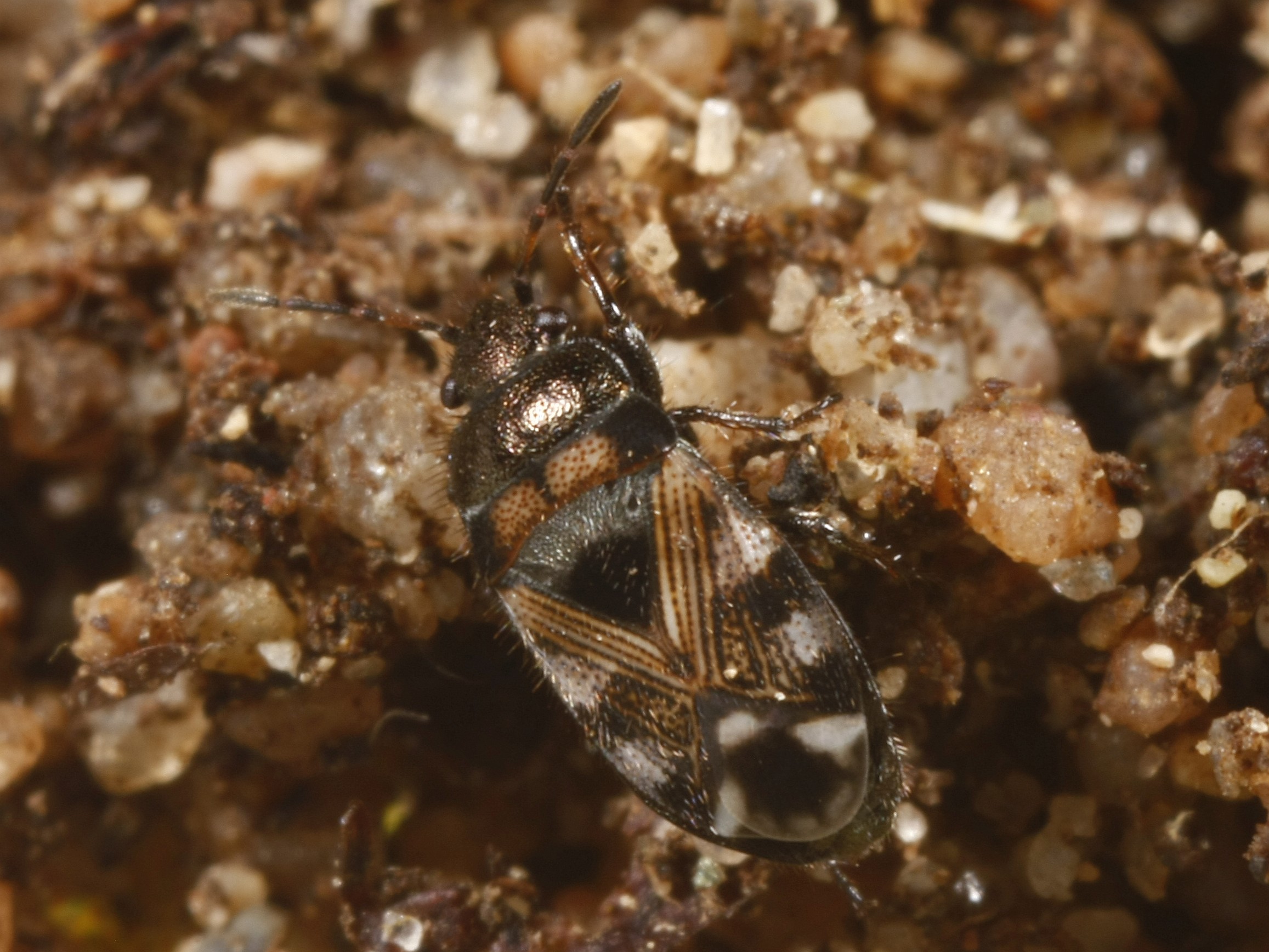Thorax: Halsschild schwarz, lang behaart, in der Vorderhälfte in der Mitte fast unpunktiert, glänzend. Halsschildhinterhälfte mit zwei fast quadratischen braunen Flecken. Halbdecken hellbraun mit dunklen Punktgruben und dunklem Fleckenmuster, dicht mit langen schwarzen abstehenden und manchmal stellenweise mit feinen gelblichweißen Haaren bedeckt. Schenkel bis auf die Spitze schwarz, Vorderschenkel ohne Zahn, Schenkelspitzen, Schienen und Tarsen bräunlich.