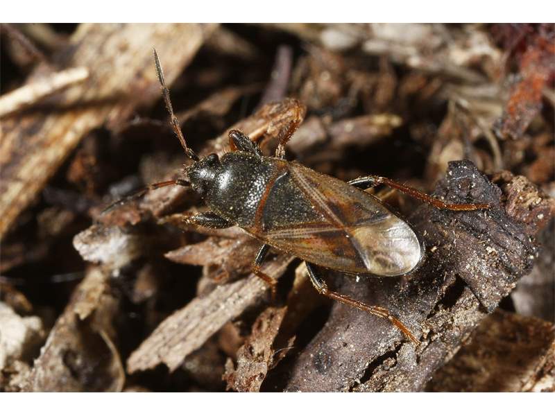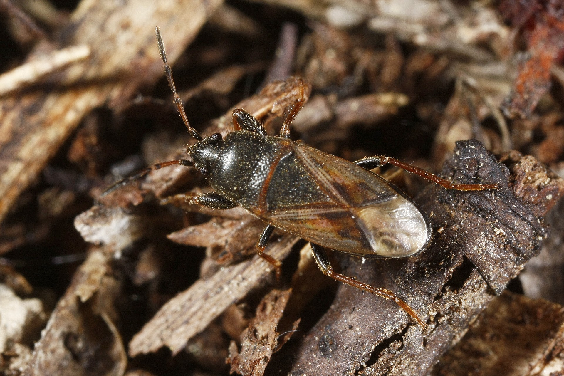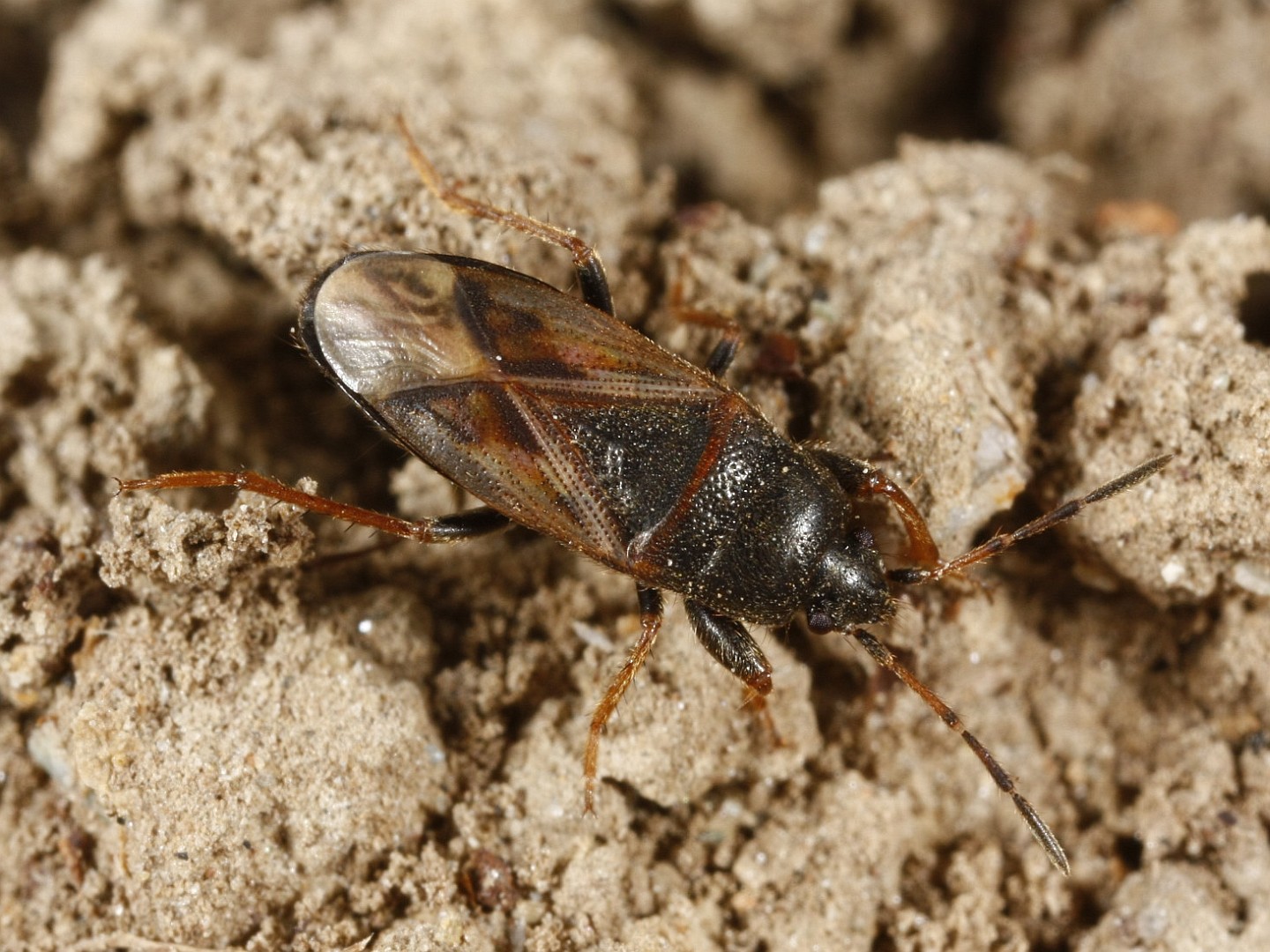 Megalonotus praetextatus mit glänzenden, fast kahlen Halbdecken.