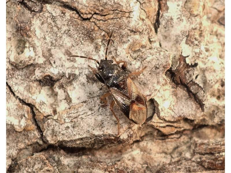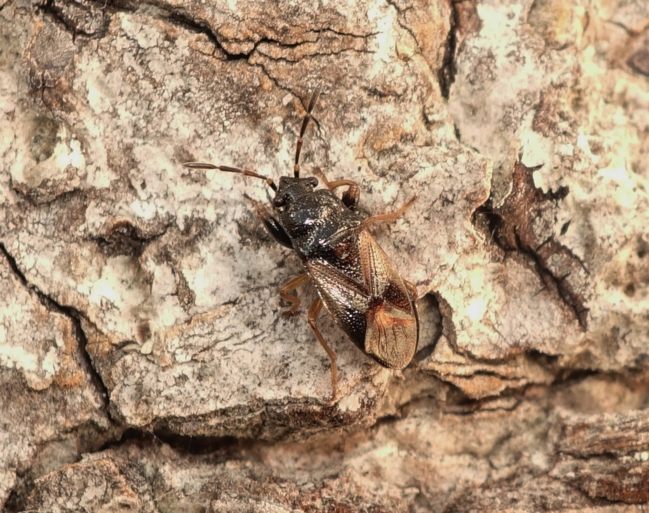 Thorax: Halsschild und Schildchen schwarz glänzend. Halbdecken im vorderen Teil braun, im hinteren schwarz, auffällig glänzend, nahezu unbehaart. Beine mit Ausnahme der schwarzen Vorderschenkel gelbbraun.