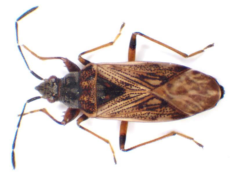 Thorax: Oberseite ohne lange Haare. Halsschild stark eingeschnürt, vorderer Teil gewölbt dunkel, hinterer Teil gelbbräunlich mit dunklen Flecken und Punktgruben. Schildchen schwarz. Halbdecken gelbbräunlich mit Reihen dunkler Punktgruben. Membran rauchbräunlich mit hellen Adern. Beine gelblich mit dunklen Ringen an den Schenkelenden. Vorderschenkel mit 2 großen und mehreren kleinen Zähnen. 1.Glied der Hintertarsen doppelt so lang, wie 2. und 3. zusammen.