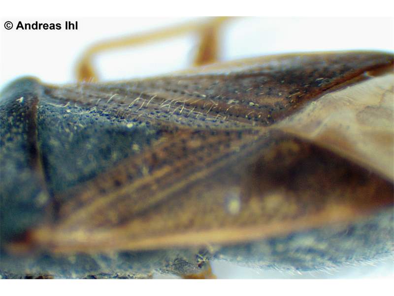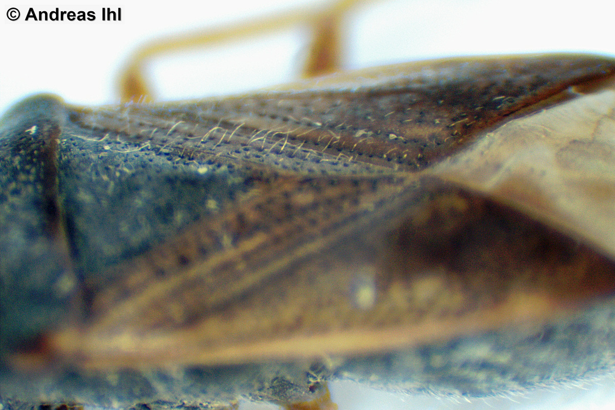 Thorax: Oberseite mit langen Haaren. Halsschild rotbräunlich, stark eingeschnürt, vorderer Teil stark gewölbt. Schildchen schwarz. Halbdecken gelbbräunlich mit Reihen dunkler Punktgruben und dunklen Flecken. Membran rauchbräunlich mit hellen Adern. Beine gelblich mit dunklen Ringen an den Schenkelenden. Vorderschenkel mit 3 großen und mehreren kleinen Zähnen. 1.Glied der Hintertarsen doppelt so lang, wie 2. und 3. zusammen.