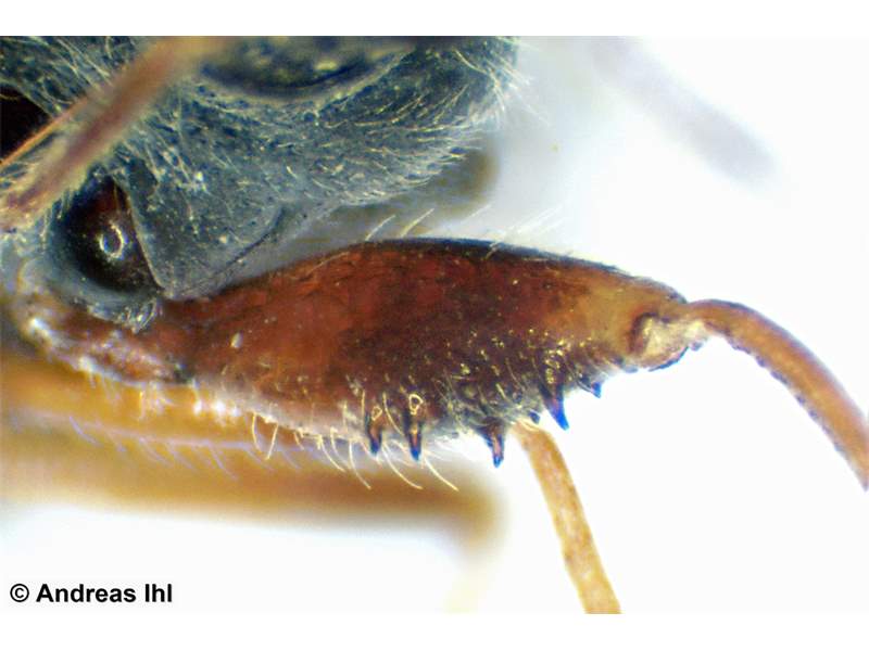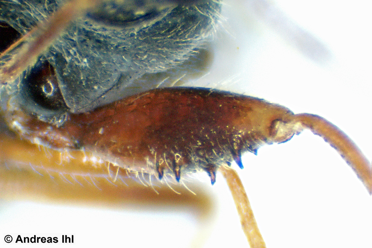 Kopf: schwarz, kurz behaart. Augen um die Hälfte ihrer Länge vom Hinterrand entfernt. Fühler bräunlich.