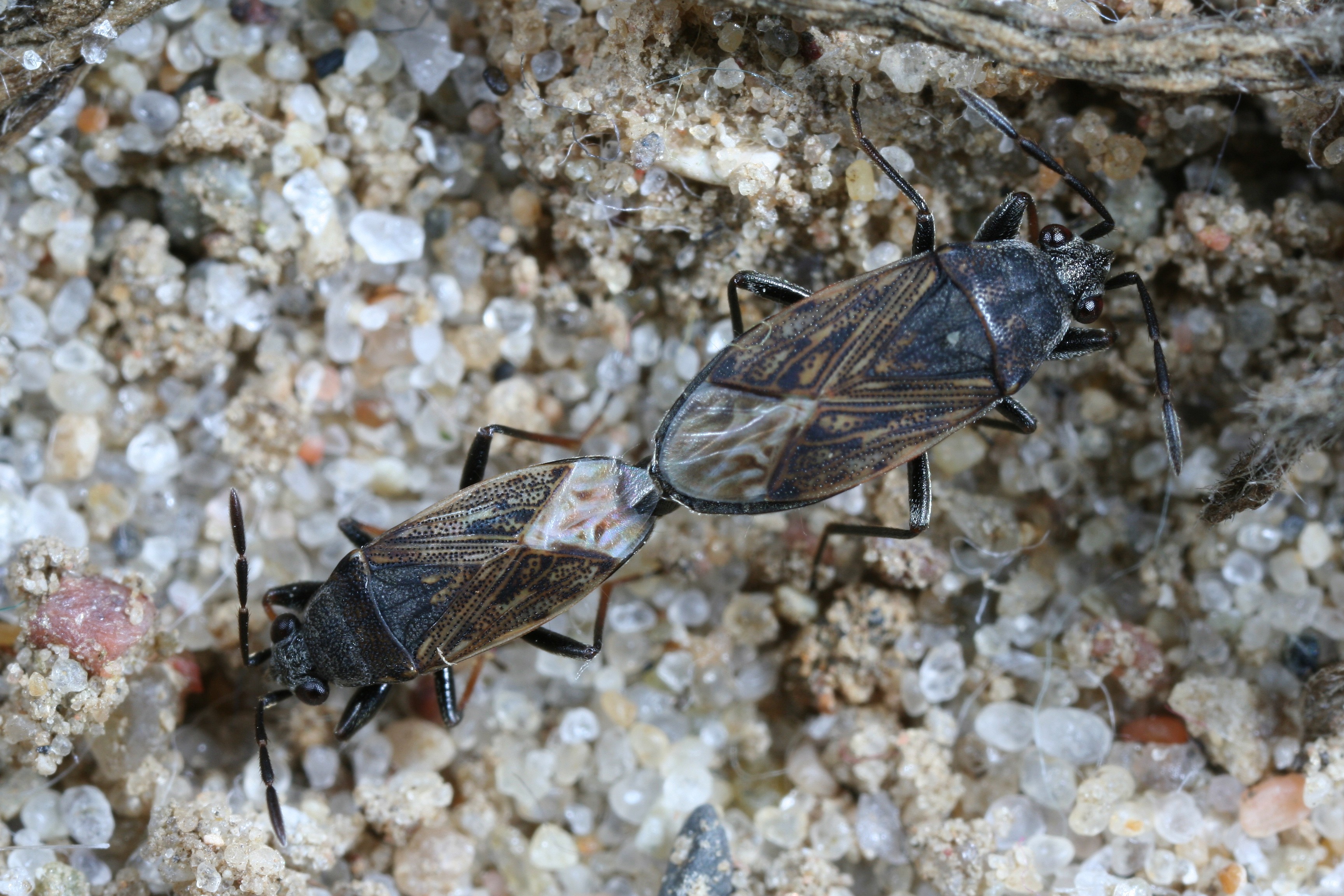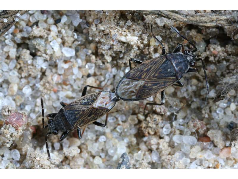 Kopulierendes Pärchen von Peritrechus geniculatus - links das kleinere Männchen rechts das Weibchen. Zickersche Berge, 250m nordwestlich des letzten Gebäudes von Groß Zicker (Deutschland, Mecklenburg-Vorpommern, Rügen), 15.06.2009