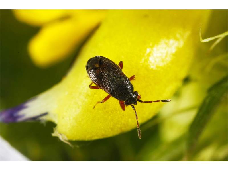 Stygnocoris rusticus mit sehr langem ersten Glied der Hintertarsen, dieses mehr als doppelt so lang, wie 2. und 3. zusammen.
