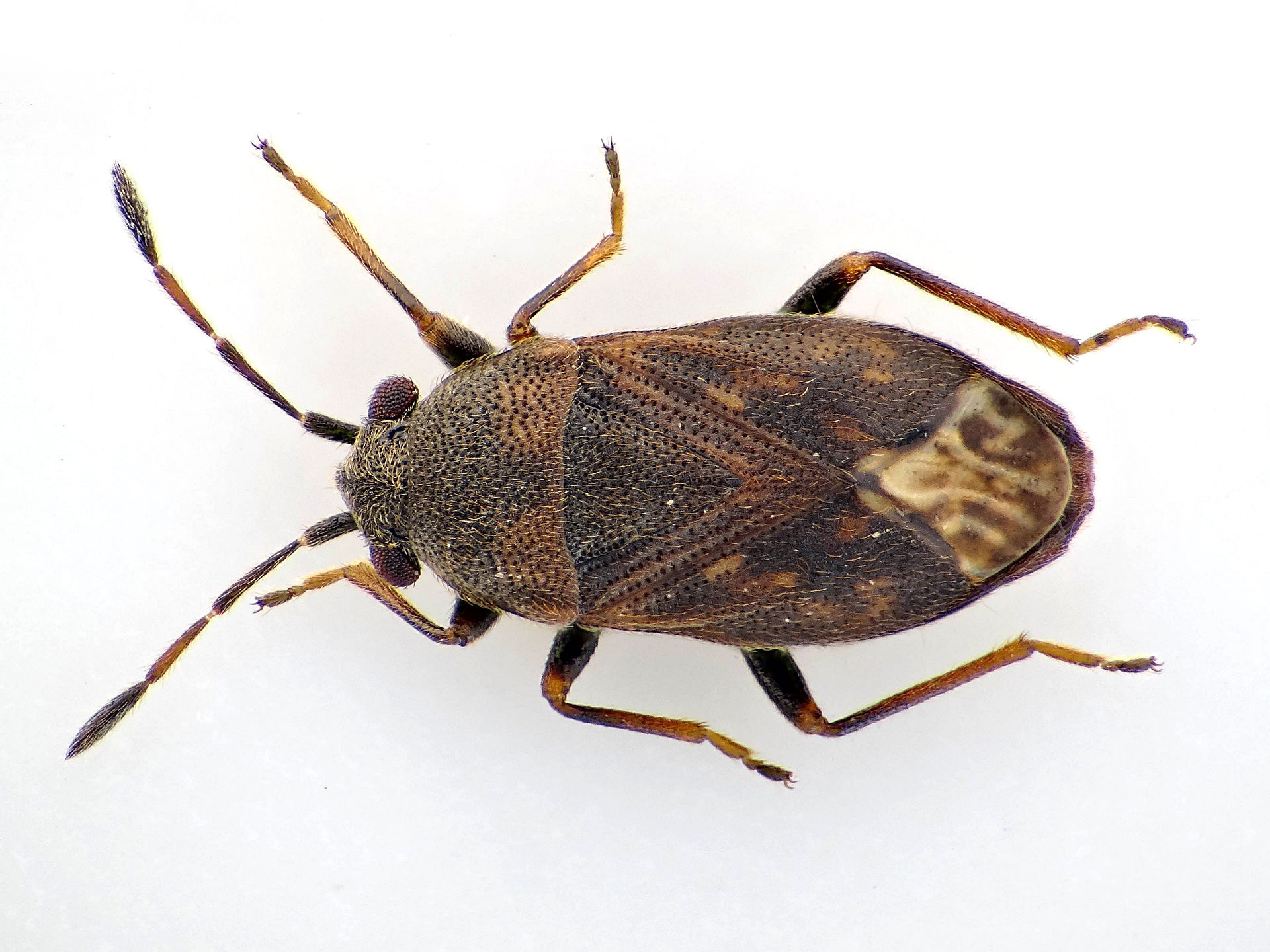Thorax: Vorderer Teil des Halsschildes und Schildchen schwarz. Hinter Teil des Halsschildes und die Halbdecken braun mit verwaschenen dunkleren Flecken. Überall kurz anliegend behaart. Schenkel schwarzbraun. Schienen und Tarsen heller.