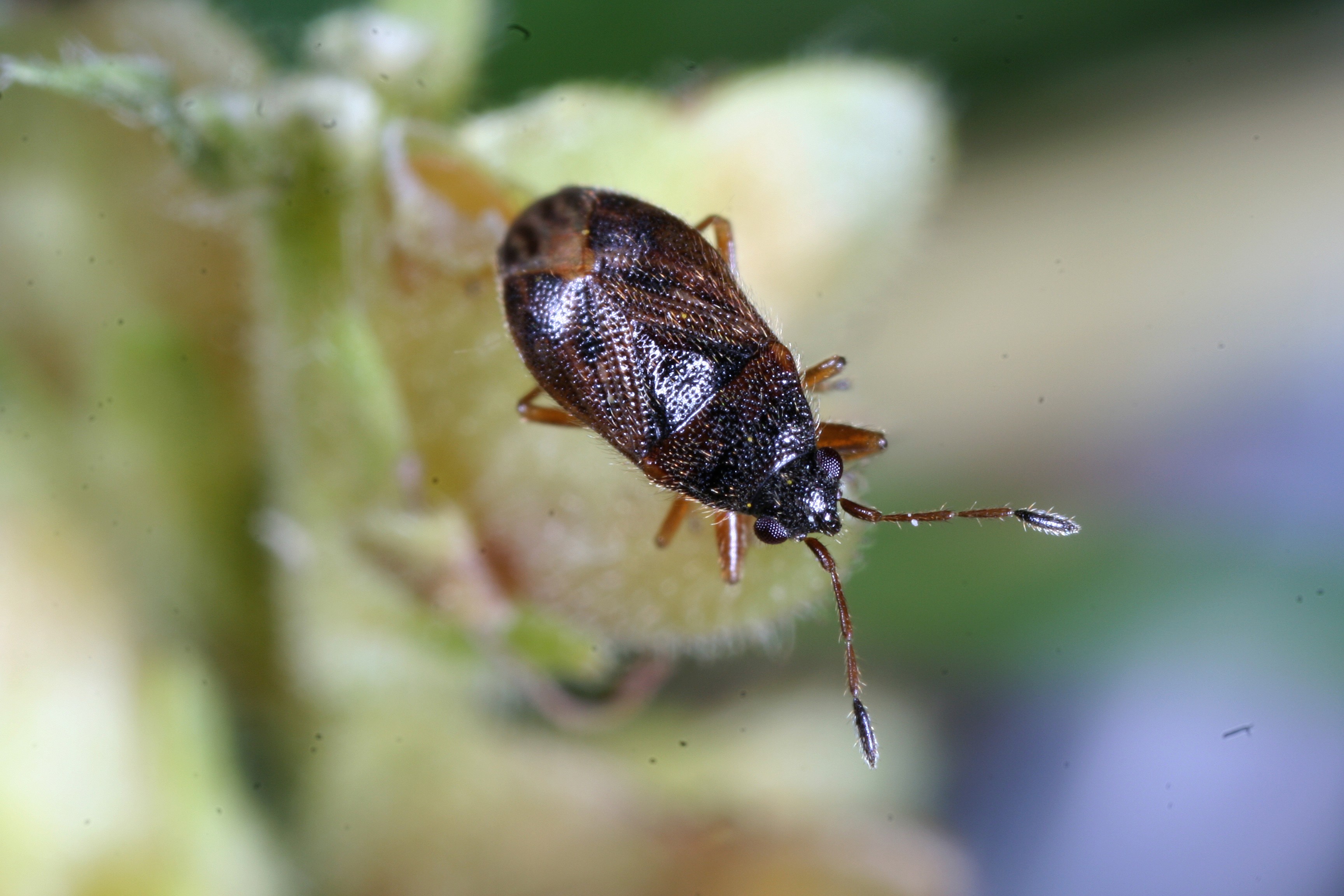 Thorax: Vorderer Teil des Halsschildes und Schildchen schwarz. Hinter Teil des Halsschildes und die Halbdecken (hell-)braun. Oberseite des Tieres glänzend und mit langen halb aufgerichteten hellen Haaren. Membran grau mit helleren Adern. Beine gelbbraun.