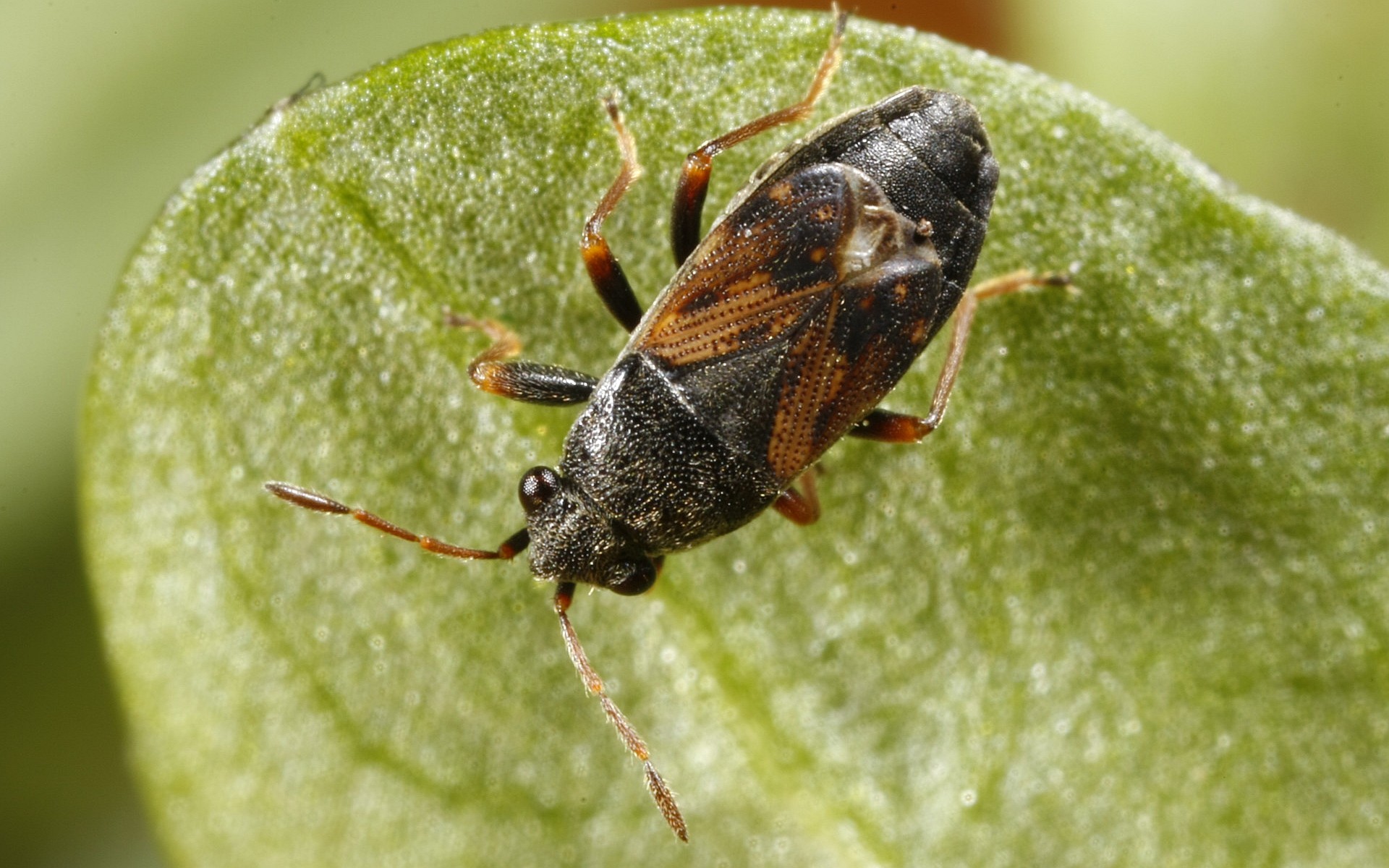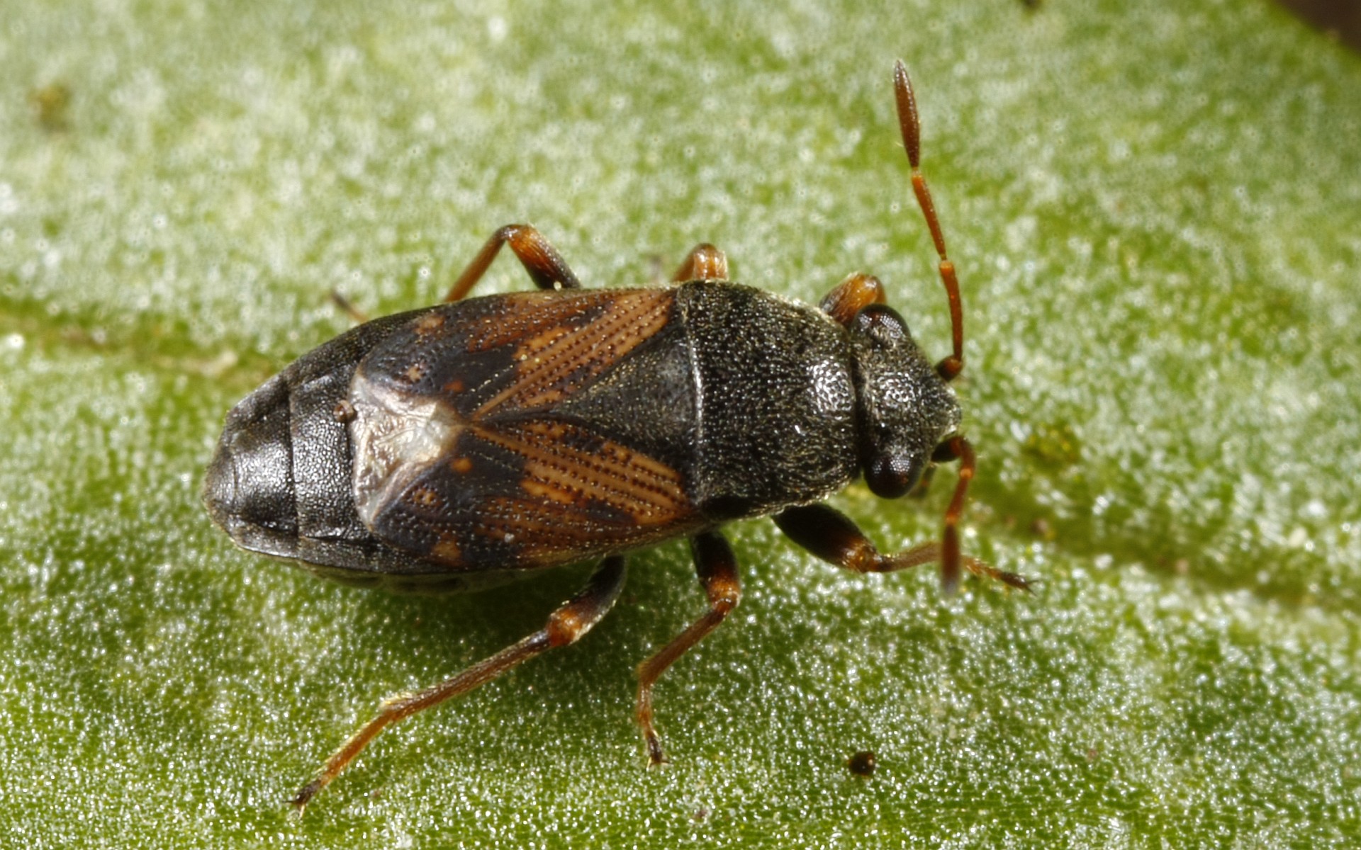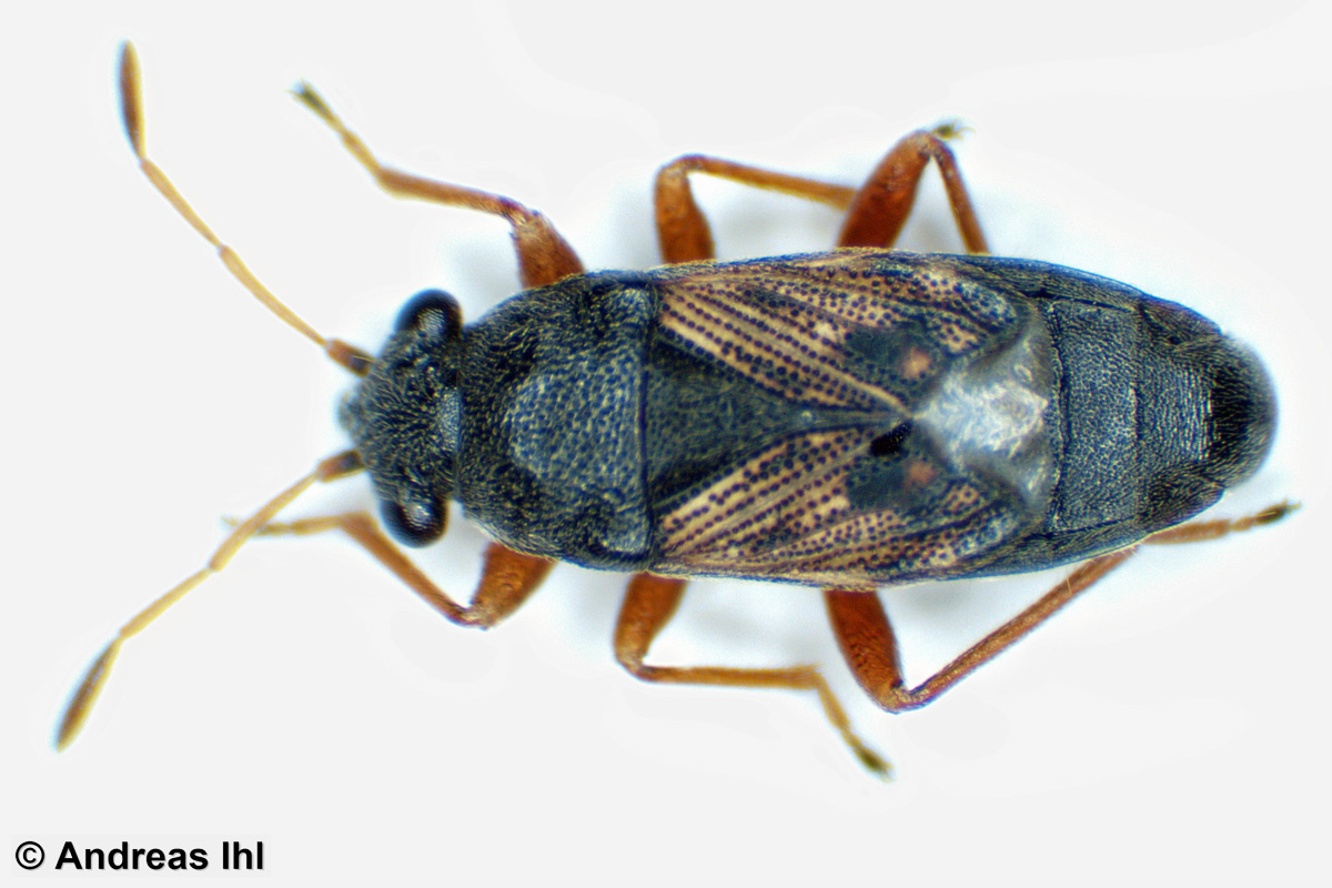 Thorax: Halsschild und Schildchen schwarz, matt, auf ganzer Fläche fein gleichmäßig punktiert. Halbdecken braun mit Reihen dunkler Punktgruben und schwarzer Zeichnung. Flügel meist verkürzt. Schenkel schwarz, an der Spitze wie die Schienen und Tarsen orangebraun.