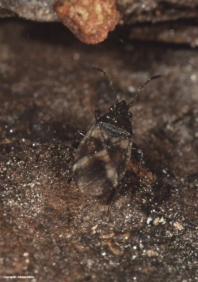 Oxycarenus modestus, Lichtenwalde, Zschopauufer bei Hofewiese, im Witerquartier unter Bergahornborke (Deutschland, Sachsen, Landkreis Mittelsachsen), 01.03.2003