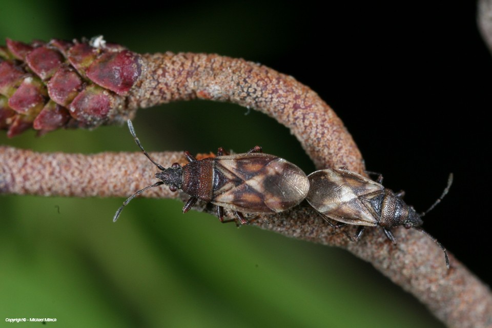 Kopula von Oxycarenus modestus (links das größere Weibchen, rechts das Männchen), Berbersdorf, Tal der Großen Striegis südlich des Fußballfeldes (Deutschland, Sachsen, Landkreis Mittelsachsen), 23.04.2008 (© Michael Münch)( Bild vergrößern)