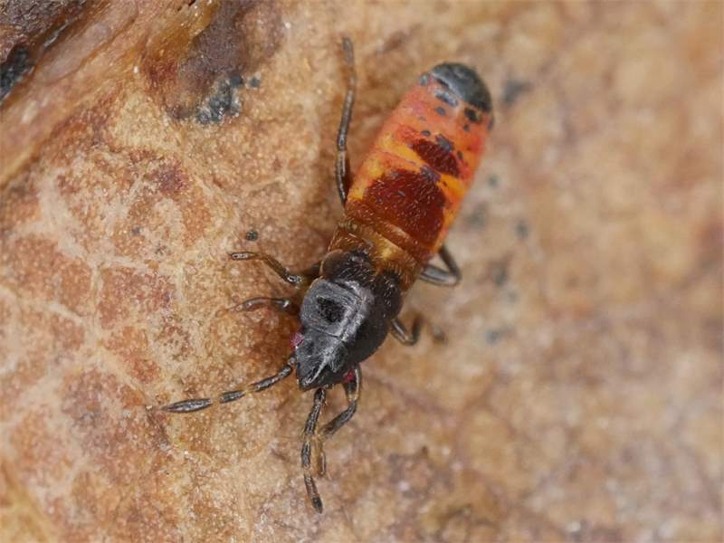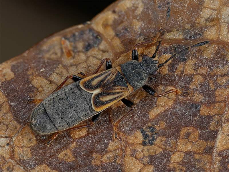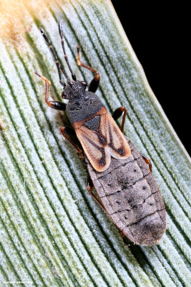 Thorax: Halsschild schwarz mit hellbraunen Hinterecken, Flügeldecken stark verkürzt oder nahezu voll entwickelt, hellbraun mit schwarzer Längsmusterung, bei langflügeligen Exemplaren Membran schwarz mit 3 weißen Malen (zwei seitlich, eines am Flügelende).