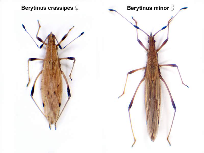 Ähnliche Arten: Berytinus hirticornis mit behaarten Fühlern und hellen Schenkelverdickungen. Berytinus clavipes mit hellen Schenkelverdickungen. Alle anderen Berytinus-Arten mit nur zwei Längsreihen von Haaren auf dem Kopf zwischen den Augen.