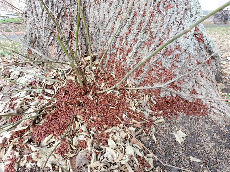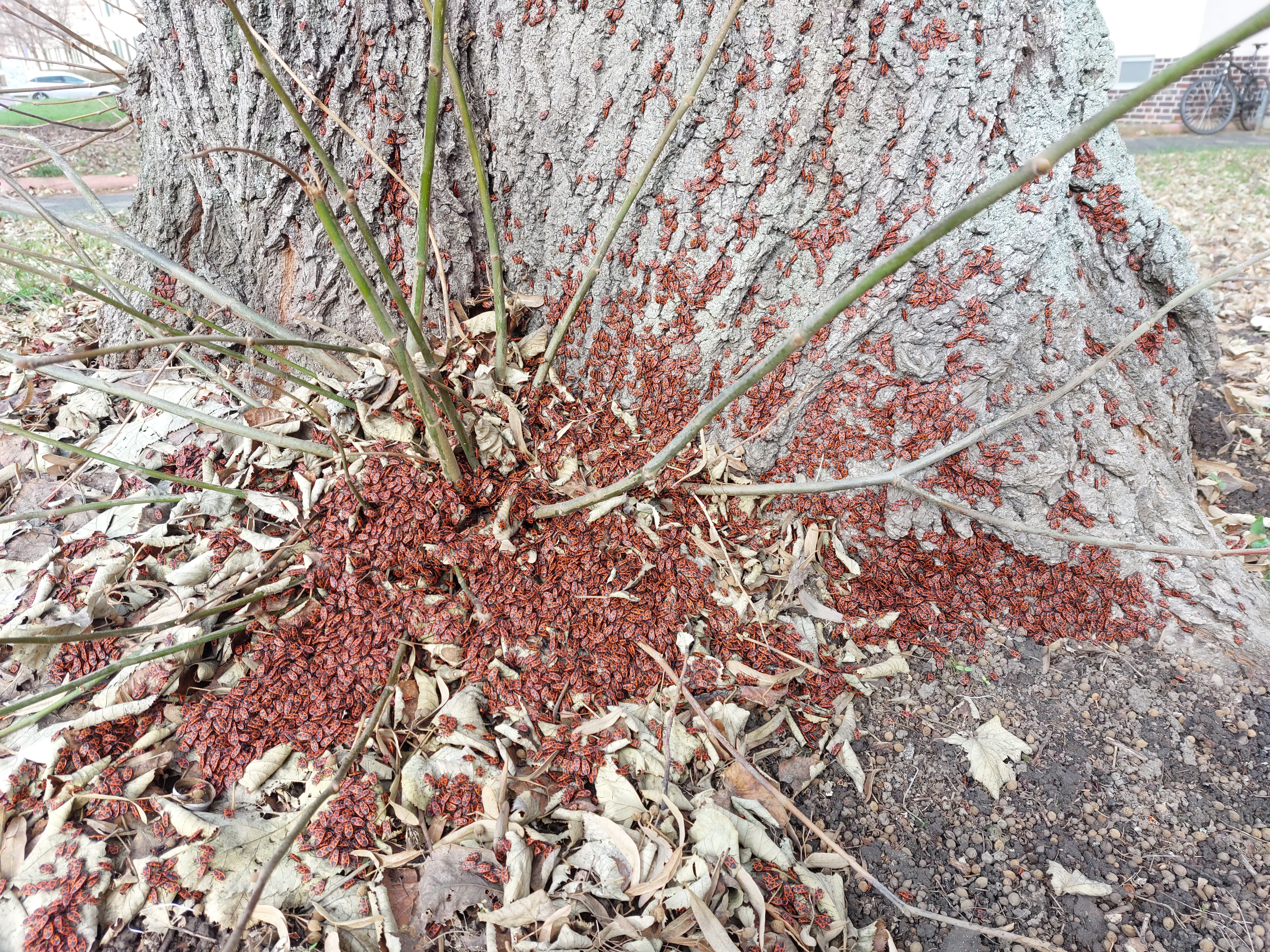 Ansammlung überwinterter Feuerwanzen am Fuße einer Linde. Waldenburg, Grünefelder Park im März 2013.
