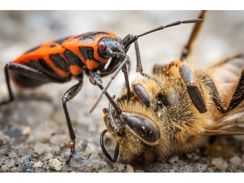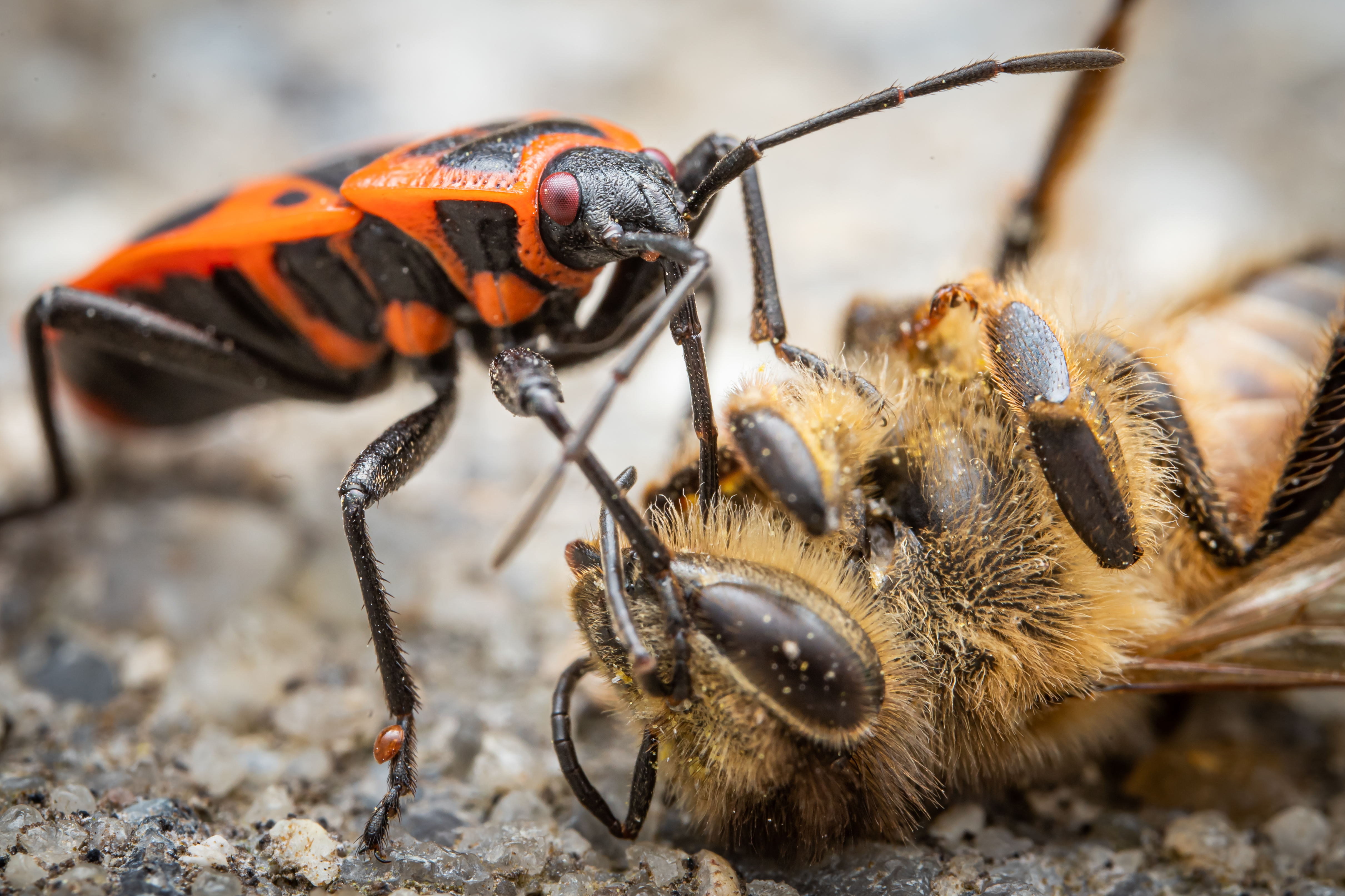 Feuerwanze saugt Honigbiene aus, Dresden, April 2023 (© Robert Michalk)( Bild vergrößern)