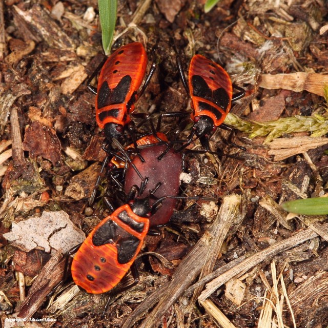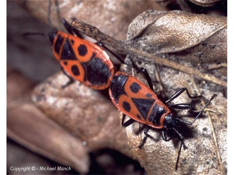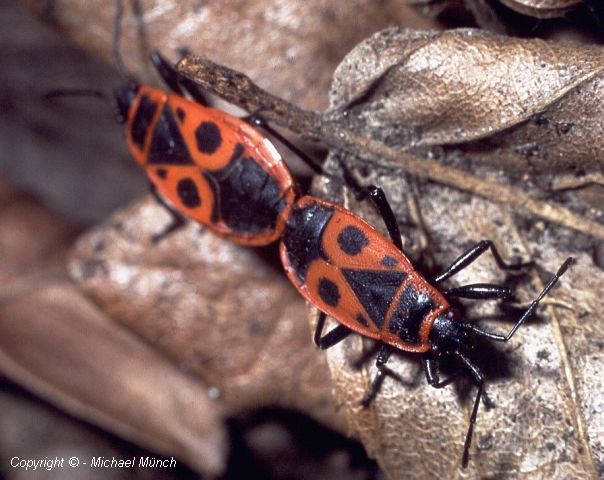 Kopulierende Feuerwanzen, Rochsburg, Landkreis Mittelsachsen, März 2003 (© Michael Münch)( Bild vergrößern)