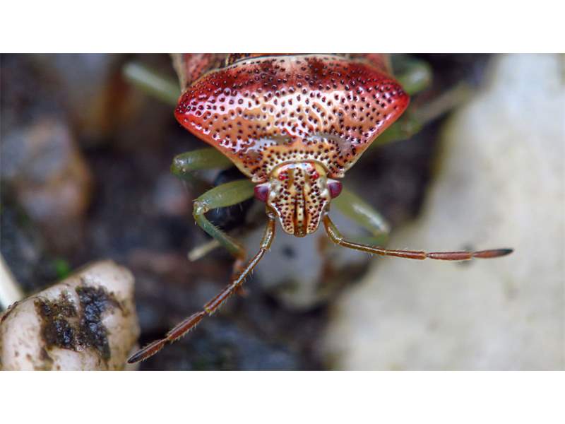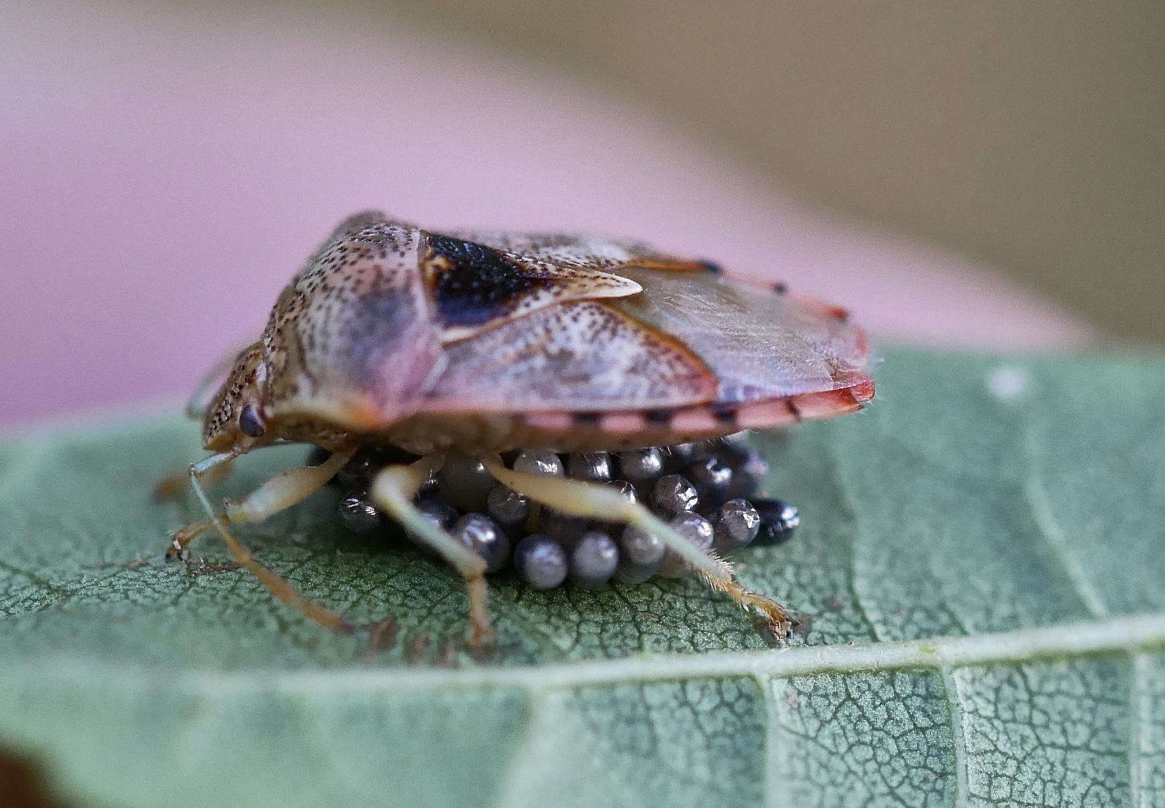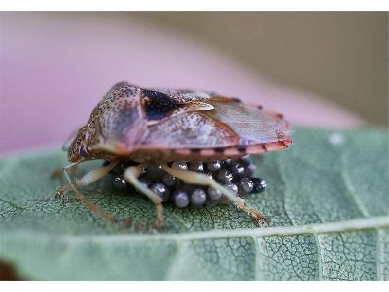 Weibchen der Fleckigen Brutwanze bei der Brutfürsorge über dem Eigelege. Bei Commerau, 17.07.2020.