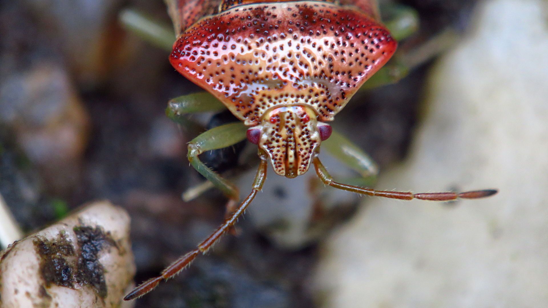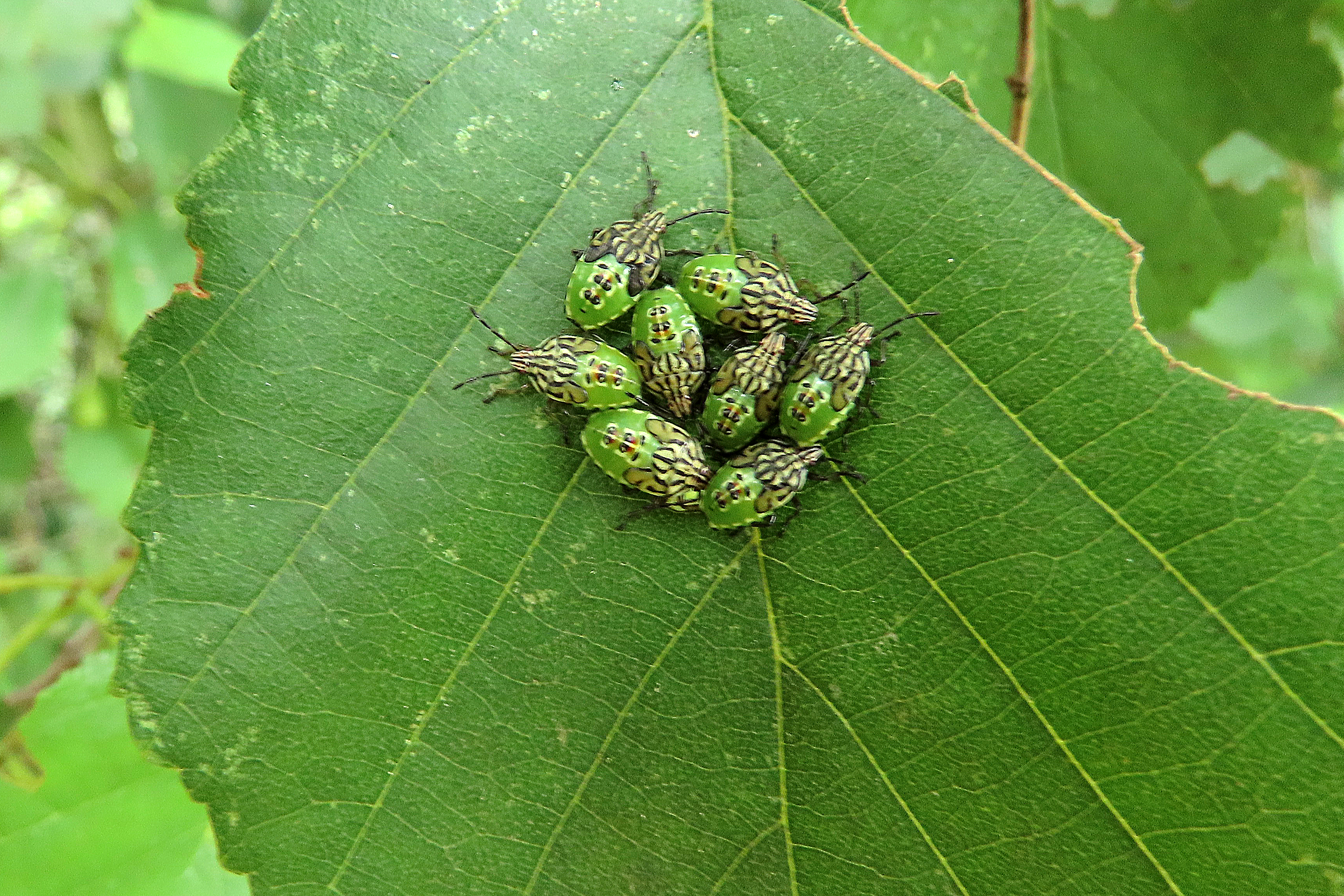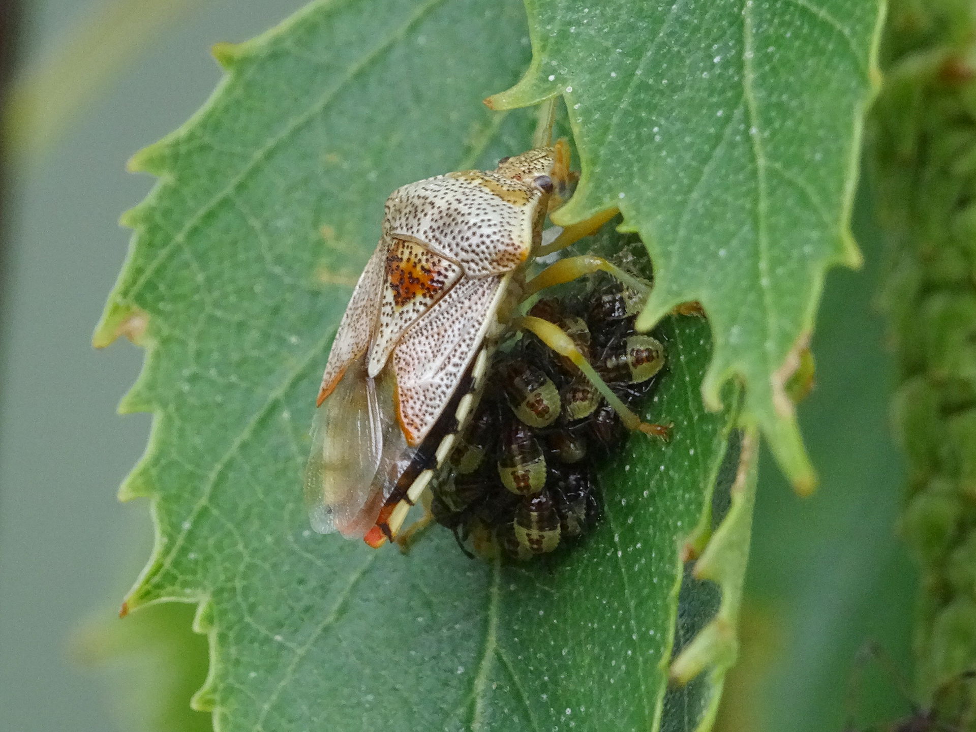 Weibchen der Fleckigen Brutwanze bei der Brutfürsorge über den Larven. Gemarkung Hohenprießnitz, Juni 2017.
