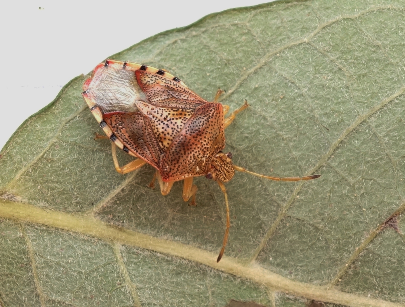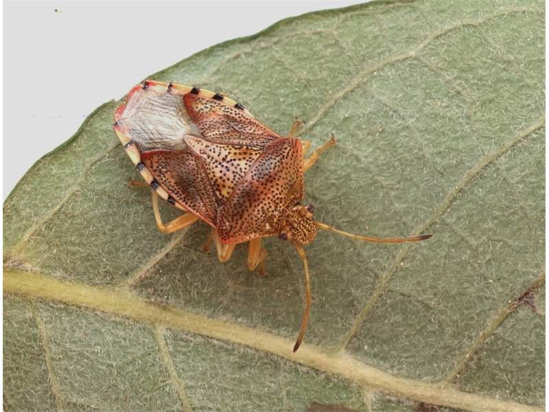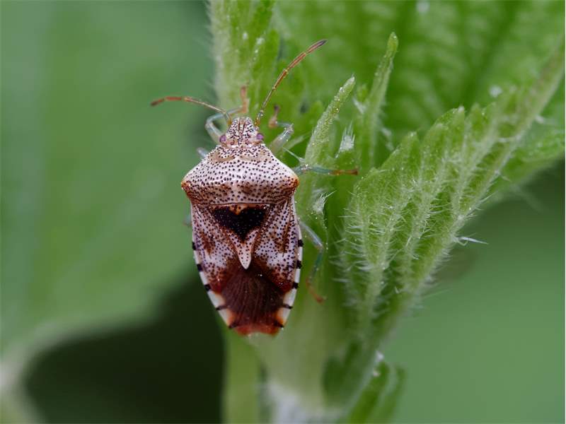 Die Zähnchen an den vorderen Ecken des Halsschildes sind im Gegensatz zu Elasmucha fieberi bei der Fleckigen Brutwanze kaum ausgeprägt. Gemarkung Hohenprießnitz, Rieselgraben am Fichtbusch, Juli 2014