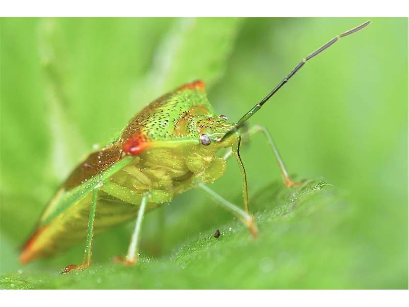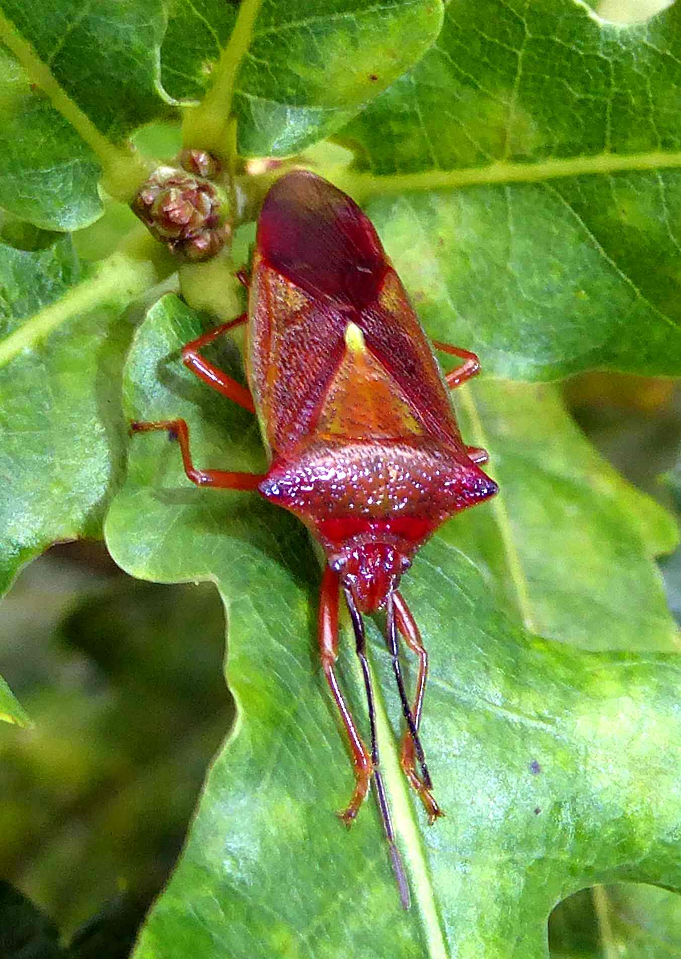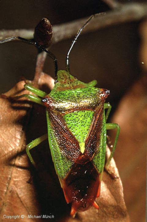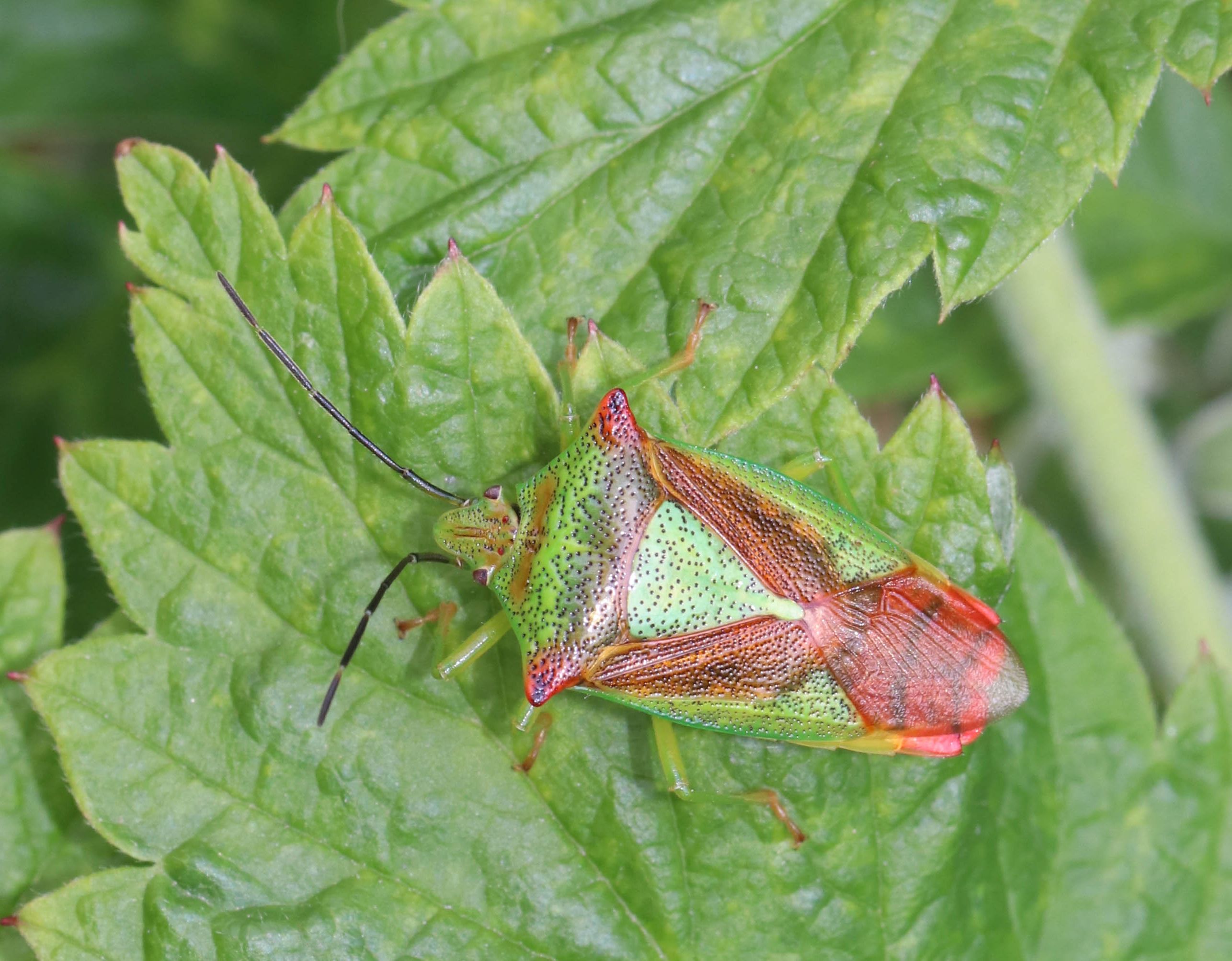 Thorax: Pronotum mit schwarzen Punktgruben, in der vorderen Hälfte grün, mehr oder weniger weinrot schattiert, die seitlichen Ecken und die hintere Hälfte weinrot. Schildchen grün, mit schwarzen Punktgruben. Das Corium der Vorderflügel mit schwarzen Punktgruben, außen grün, innen weinrot das Schildchen begrenzend. Der hintere membranöse Teil der Vorderflügel mit Ausnahme der äußersten Spitze weinrot. Zum Winter ändert sich die Färbung der Adulten nach rot-braun, im Frühjahr wieder nach grün.