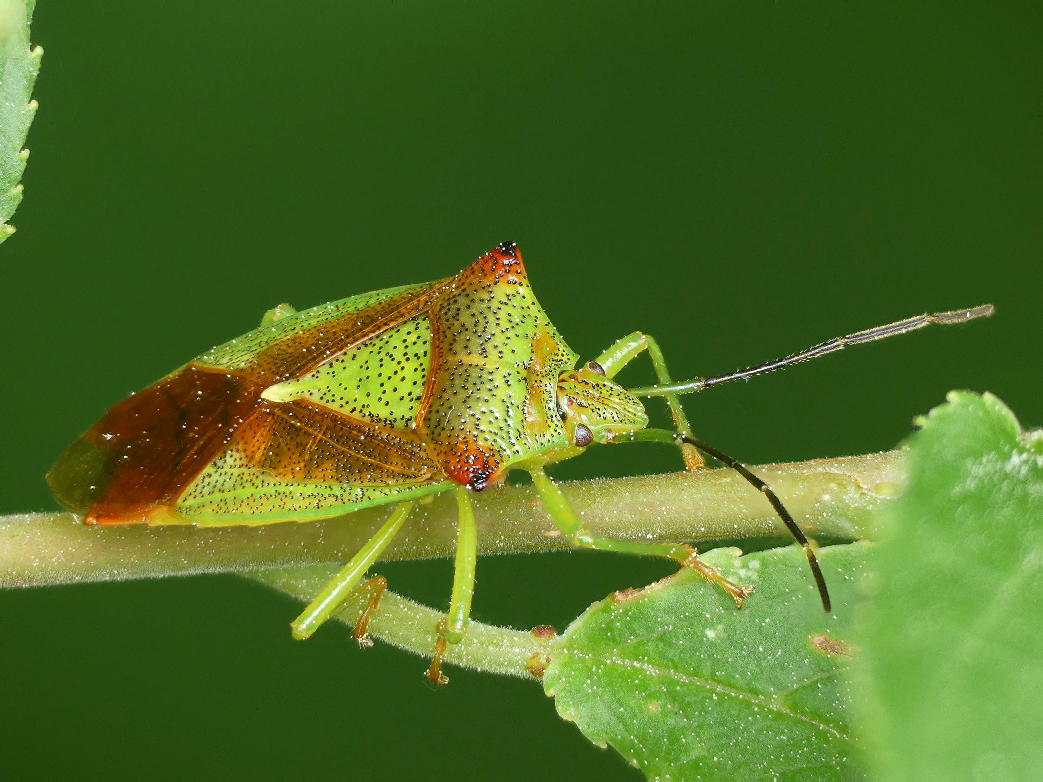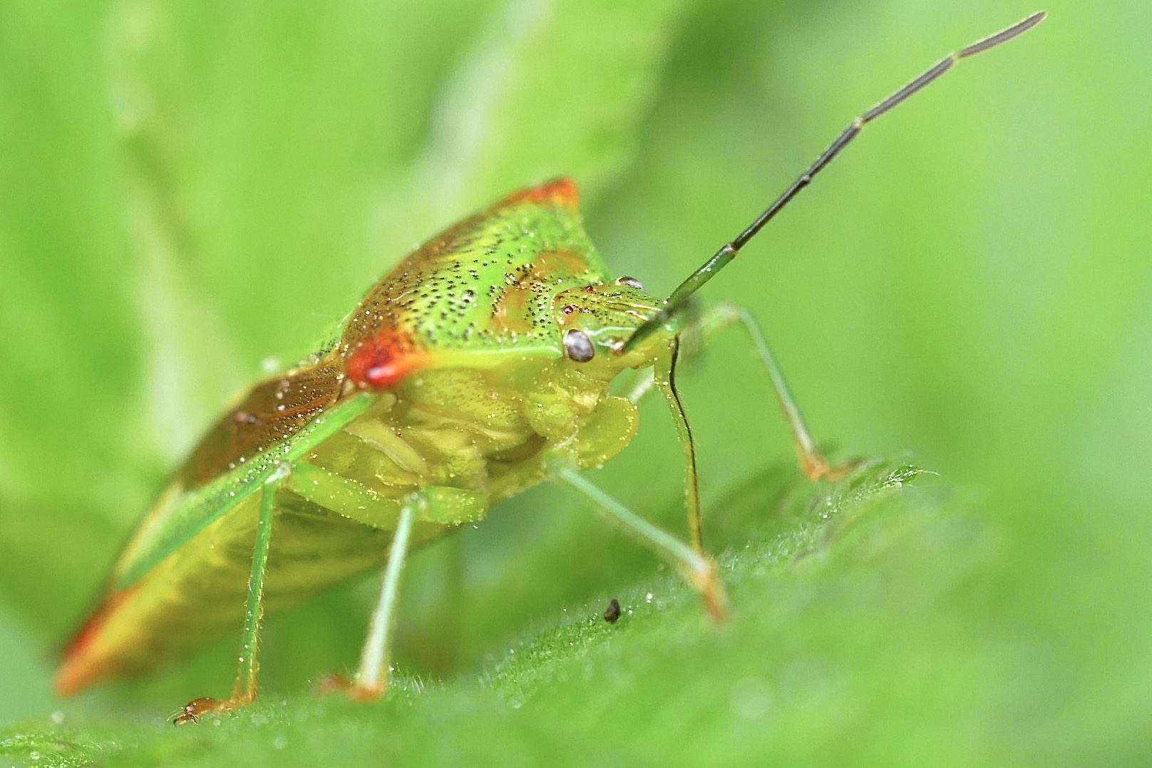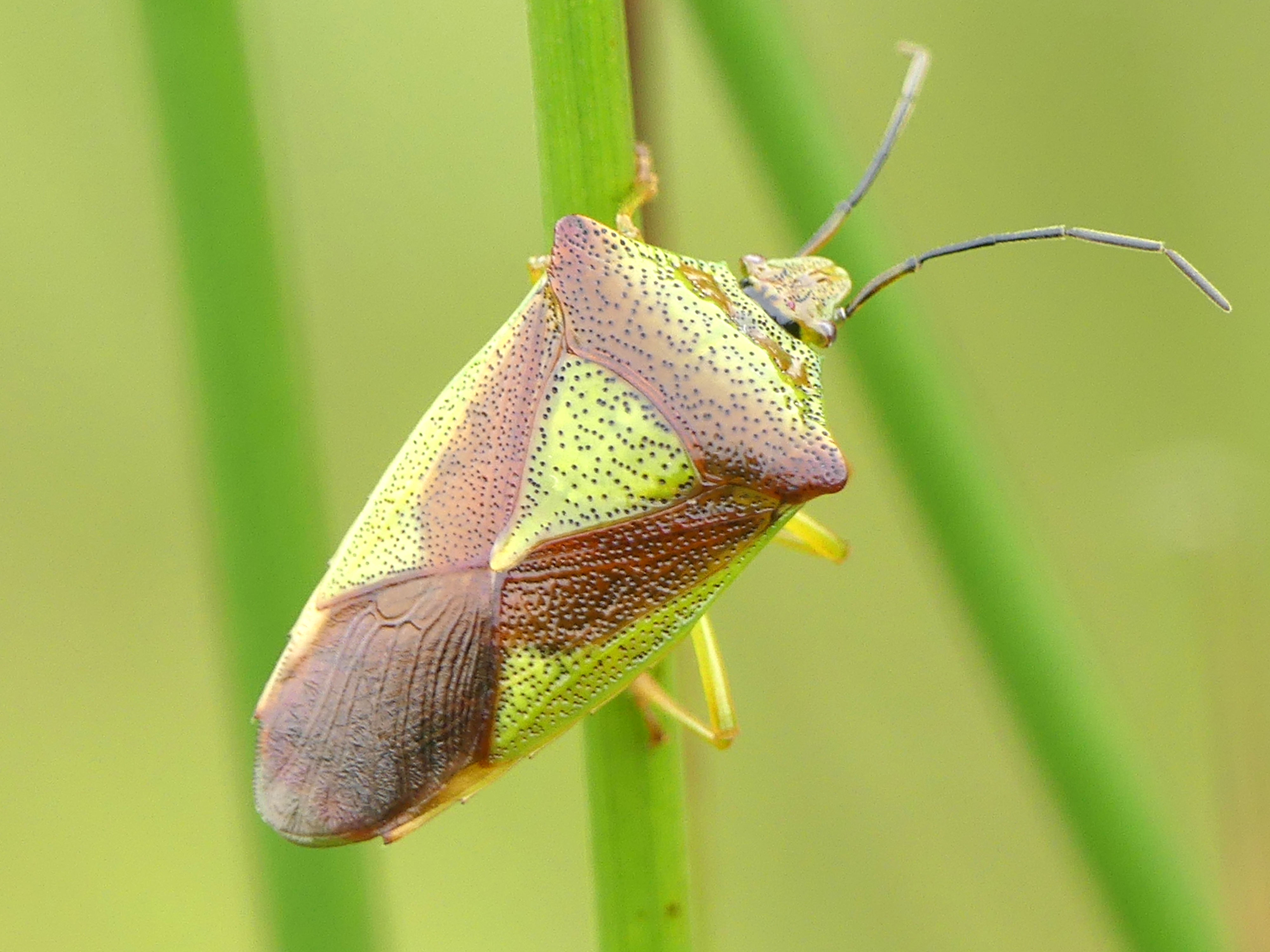 Thorax: Pronotum mit schwarzen Punktgruben, in der vorderen Hälfte grün, mehr oder weniger weinrot schattiert, die seitlichen Ecken und die hintere Hälfte weinrot. Schildchen grün, mit schwarzen Punktgruben. Das Corium der Vorderflügel mit schwarzen Punktgruben, außen grün, innen weinrot das Schildchen begrenzend. Der hintere membranöse Teil der Vorderflügel mit Ausnahme der äußersten Spitze weinrot. Zum Winter ändert sich die Färbung der Adulten nach rot-braun, im Frühjahr wieder nach grün.