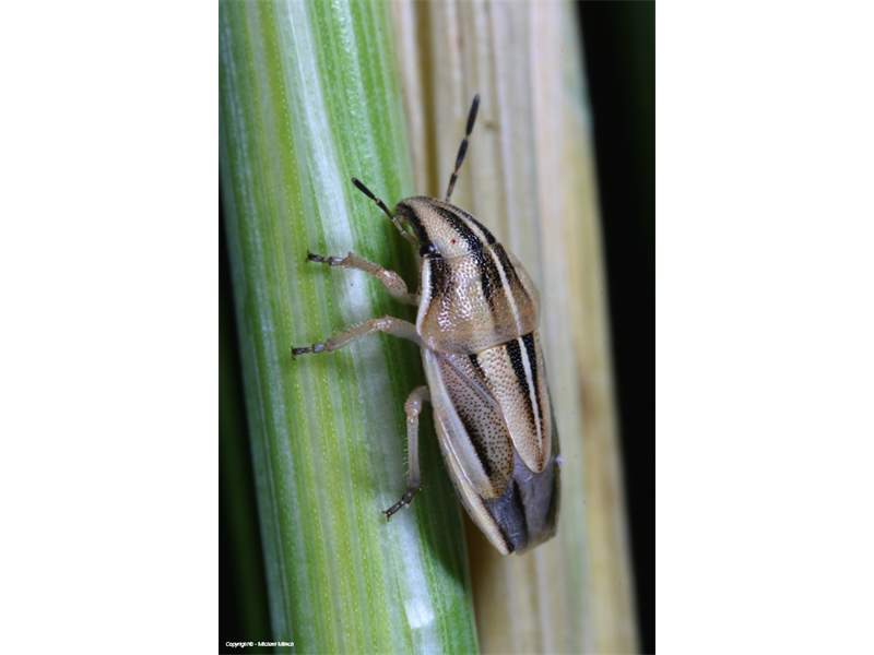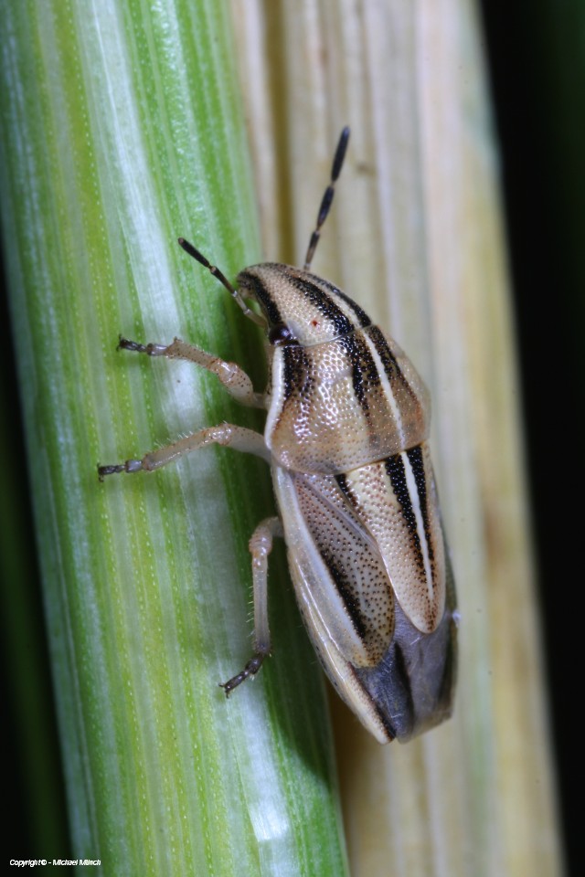 Thorax: Halsschild und Halbdecken hell oder orange-braun mit dunklen Längsstreifen, die sich vom Kopf aus fortsetzen. Halbdecken mit dunklem Längsmakel im hinteren Drittel. Schenkel (Femora) der Mittel- und Hinterbeine auf der Unterseite ohne schwarzen Flecken.