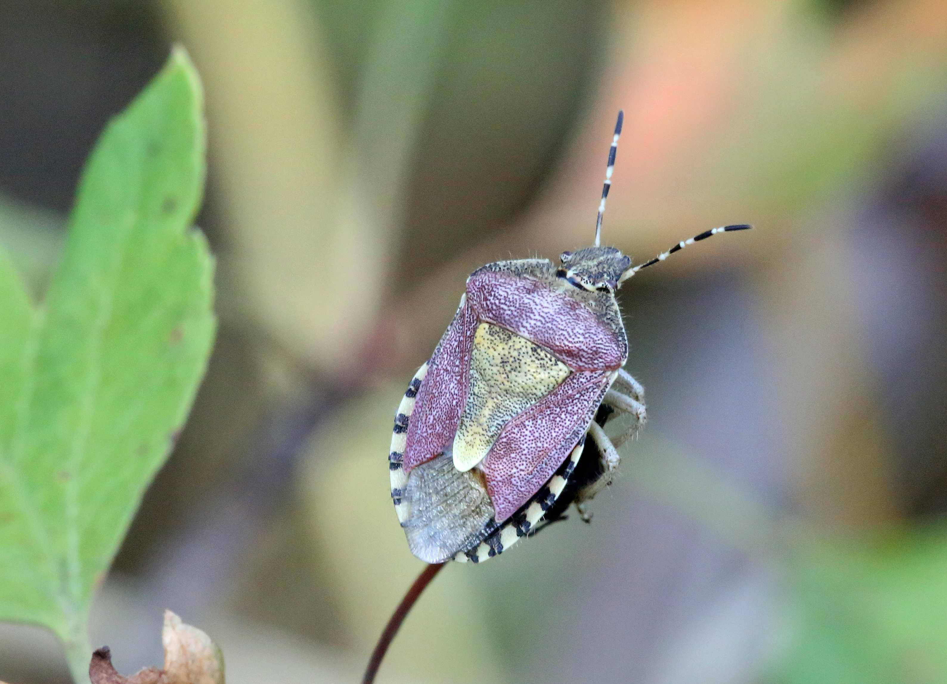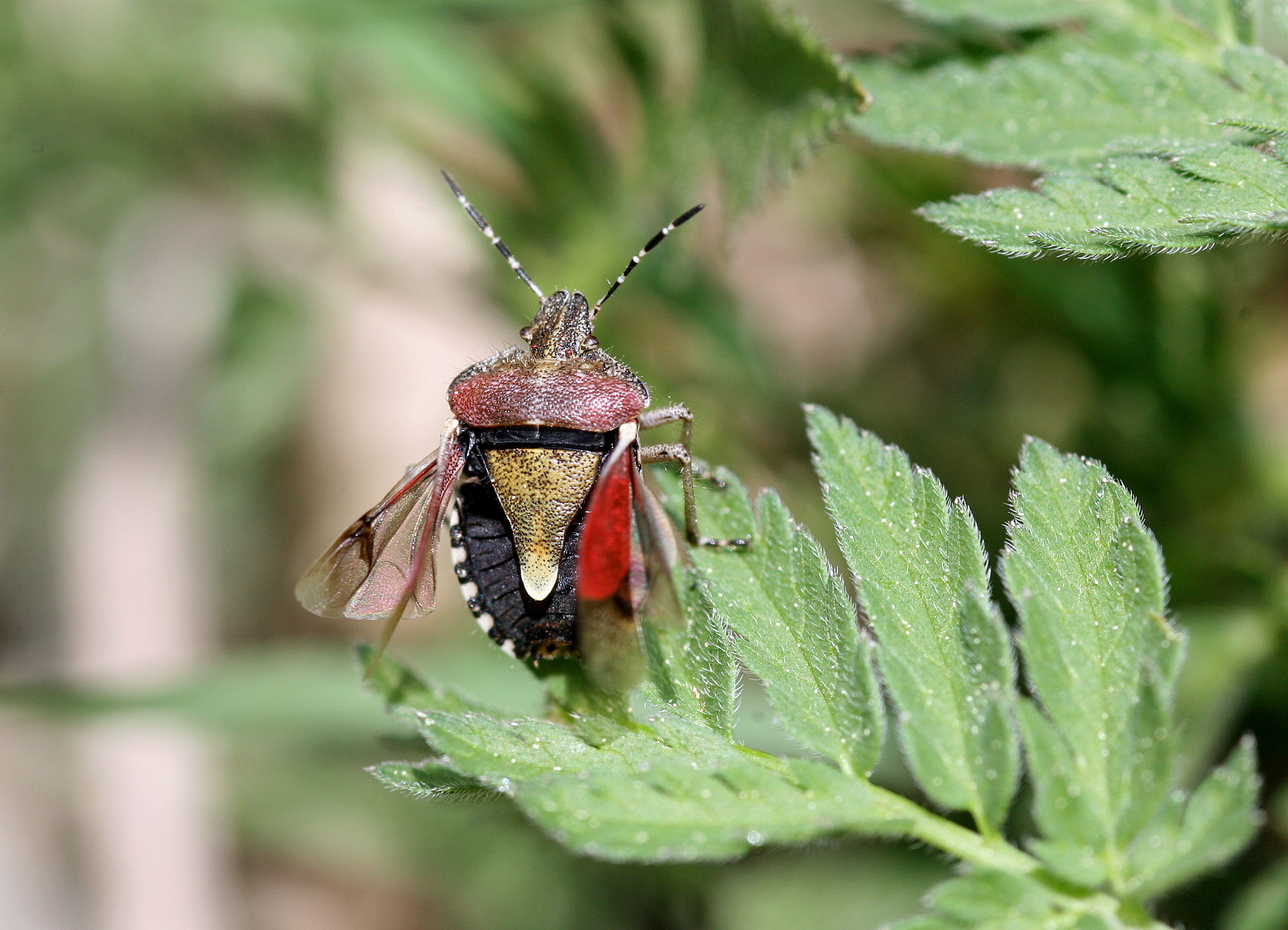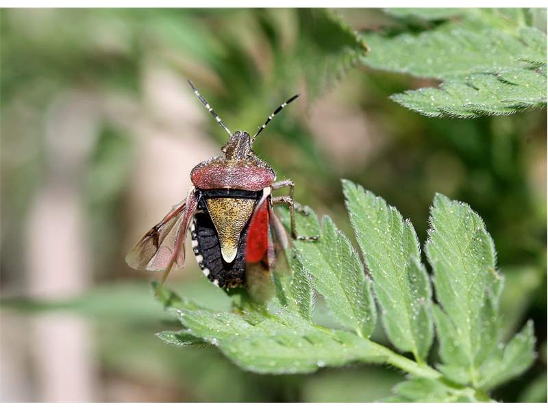 Thorax: Pronotum und der feste Teil der Vorderflügel (Corium) rötlich gefärbt, Scutellum grünlich bis bräunlich, mit heller Spitze. Beine hell mit dunklen Punkten und Flecken.
