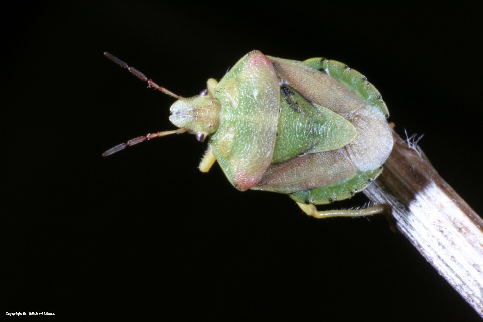 Thorax: Halsschild, Schildchen und Halbdecken Gelbgrünlich bis ockergelb, teilweise rötlich gefärbt, Schenkel unterseits mit schwarzem Fleck vor der Spitze.