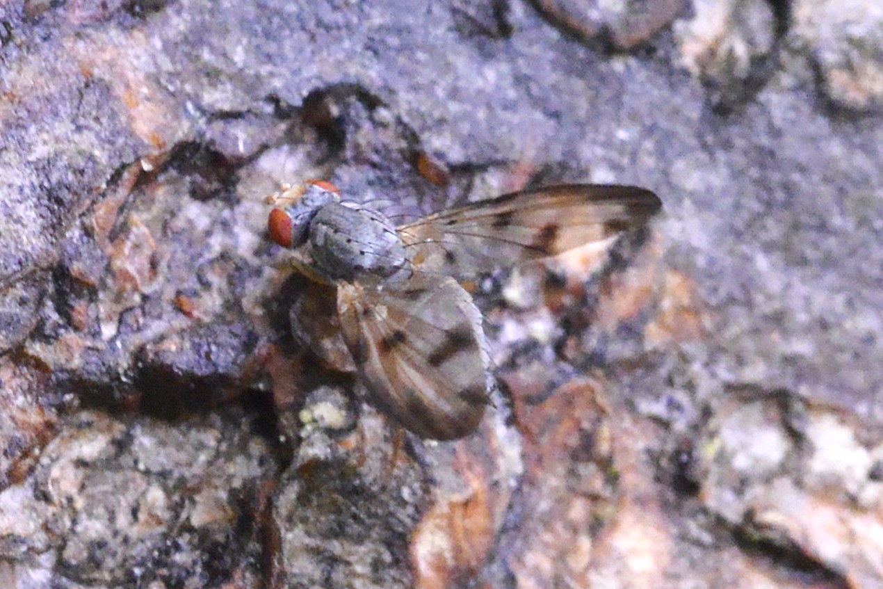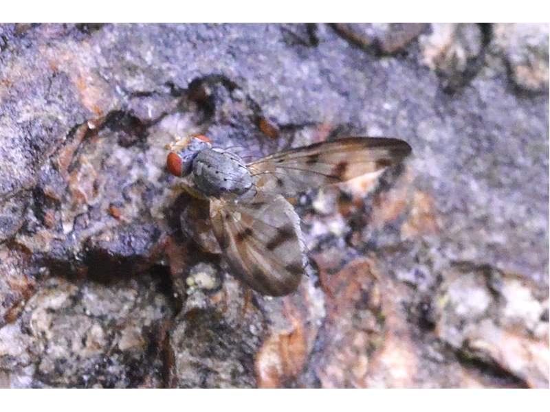 Thorax: Flügel überragen den Körper deutlich, diese mit dunklem Saum an den Flügelspitzen sowie je einem großen, dunklen, länglichen Fleck an der Flügelinnenseite und einem weiteren dunklen, kleineren Fleck mittig im Flügel sowie einem sehr kleinen, dunklen Fleck am Ende der Analader.