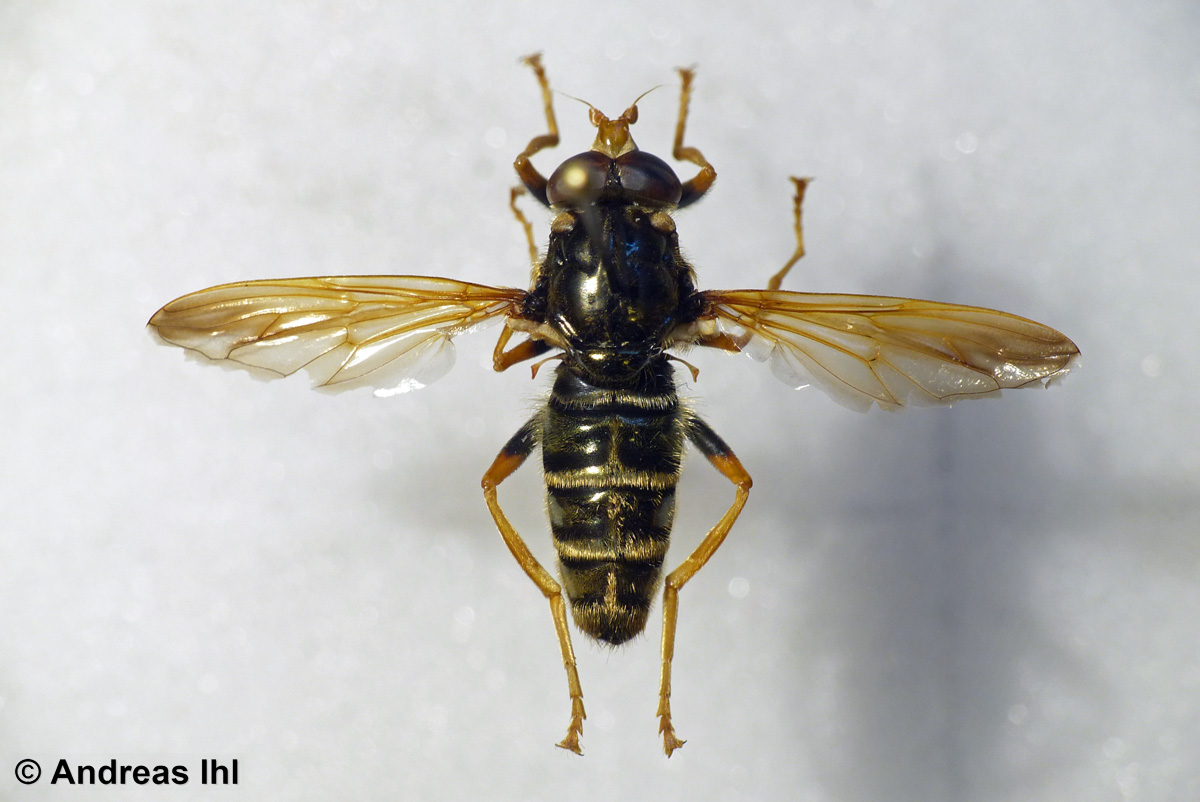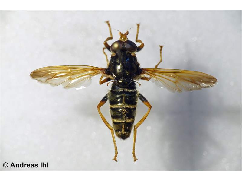 Thorax: Scutellum ohne Borsten; Flügel gelb getönt mit verdunkelter Spitze.
