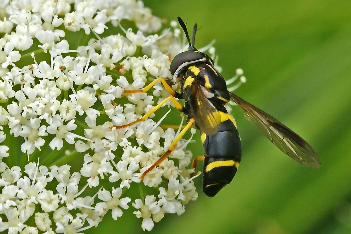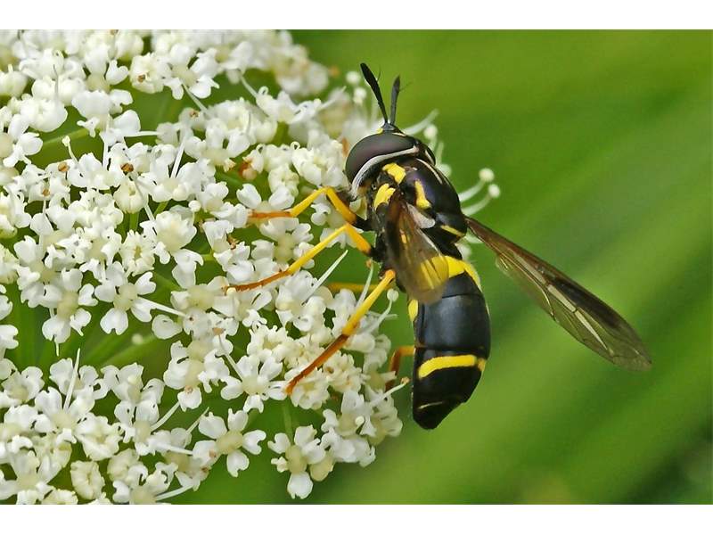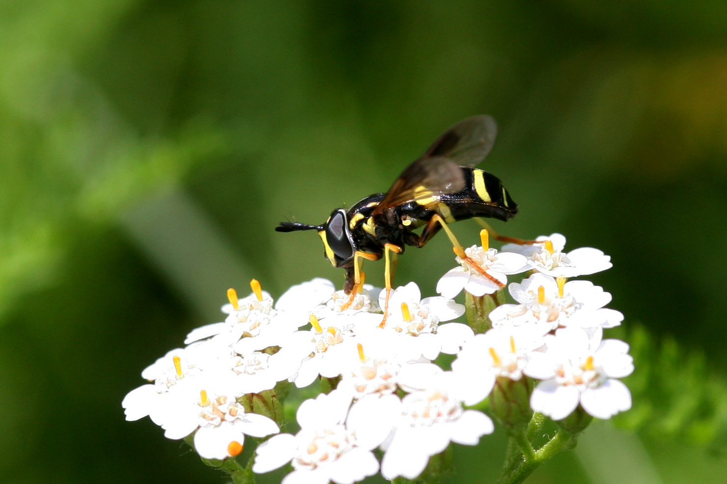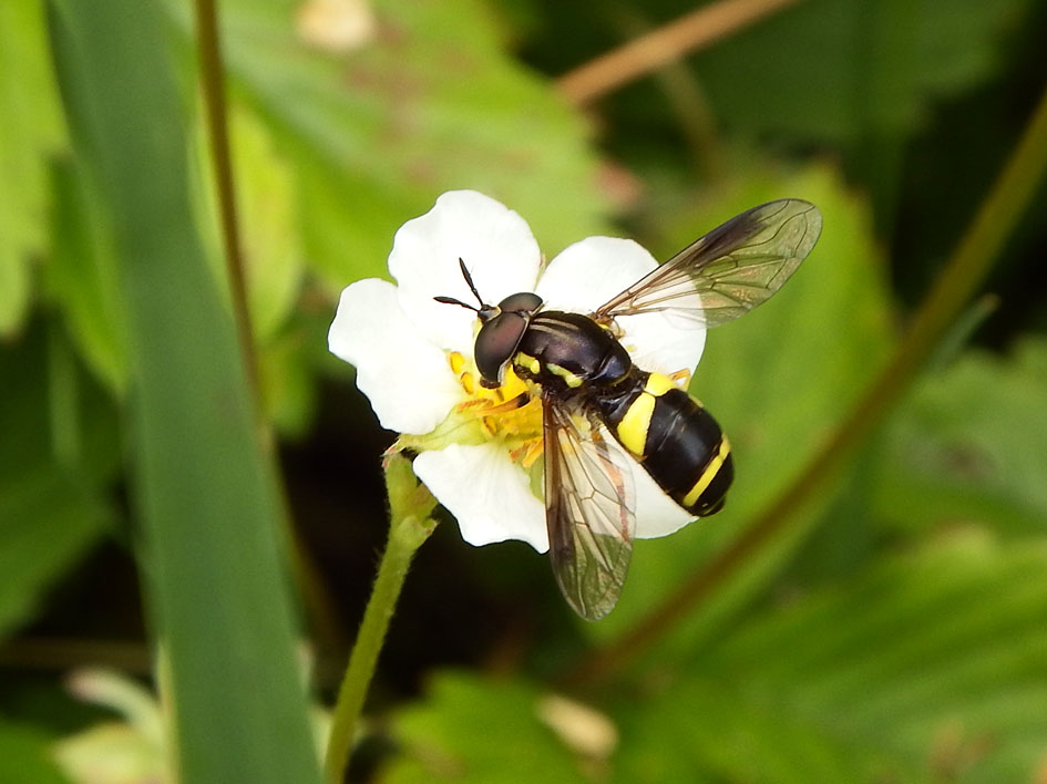 Dasysyrphus tricinctus deutlich kürzere Fühler und Thorax ohne gelbe Seitenlinien.