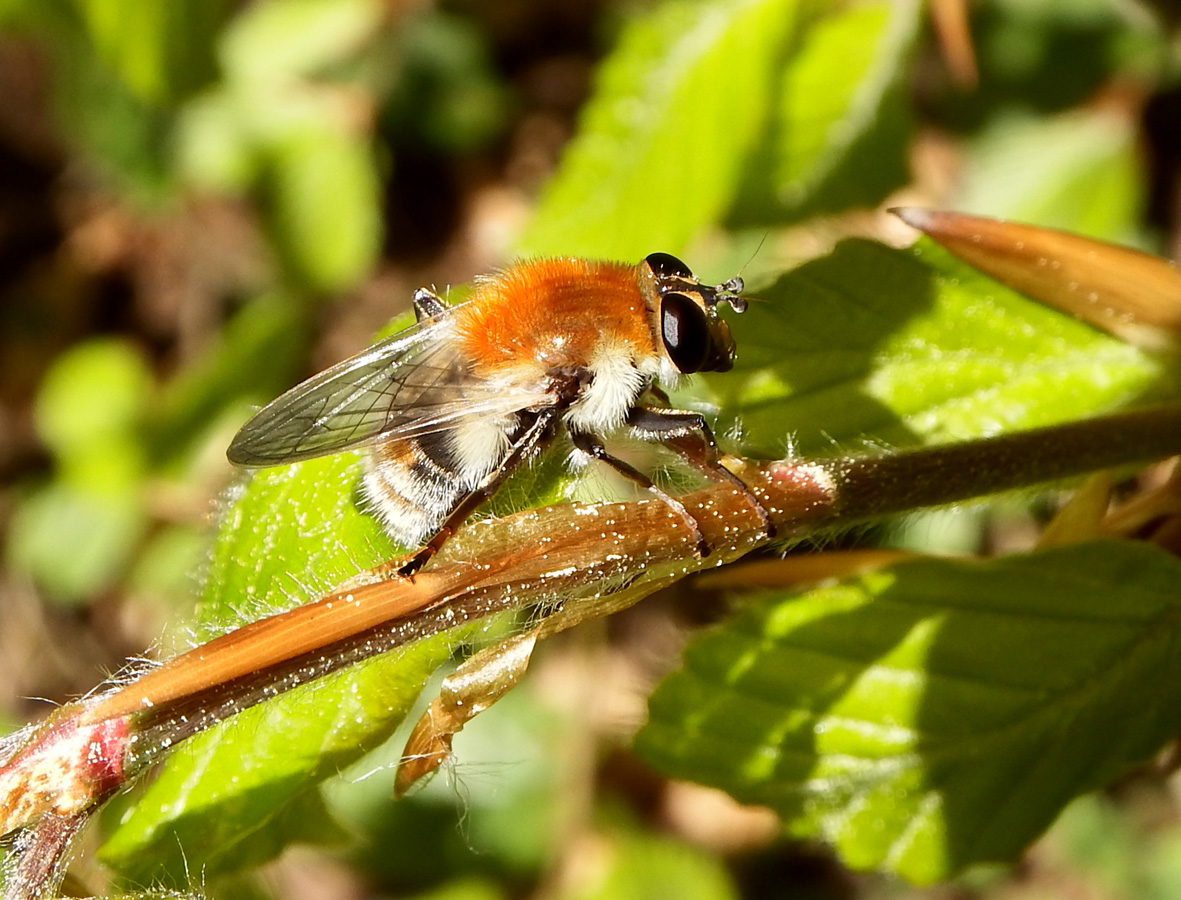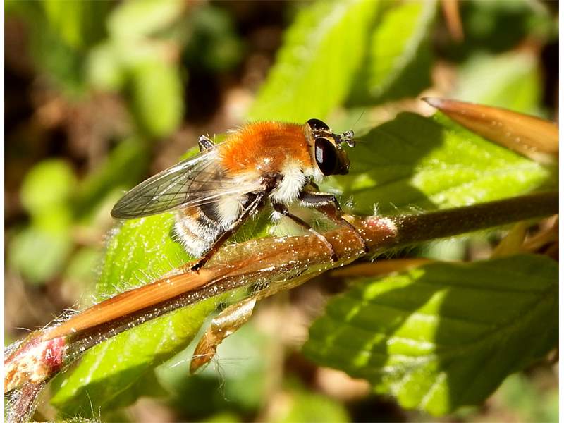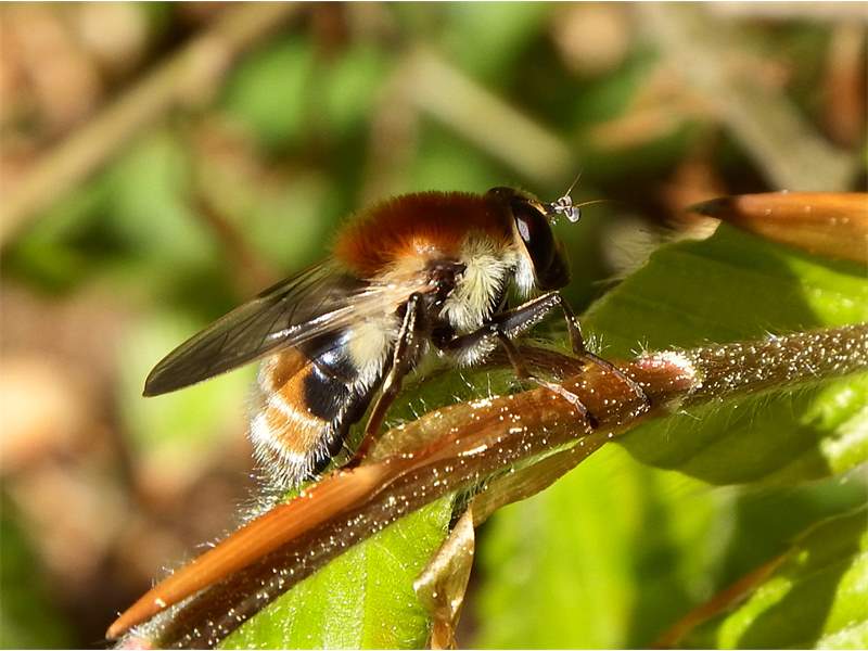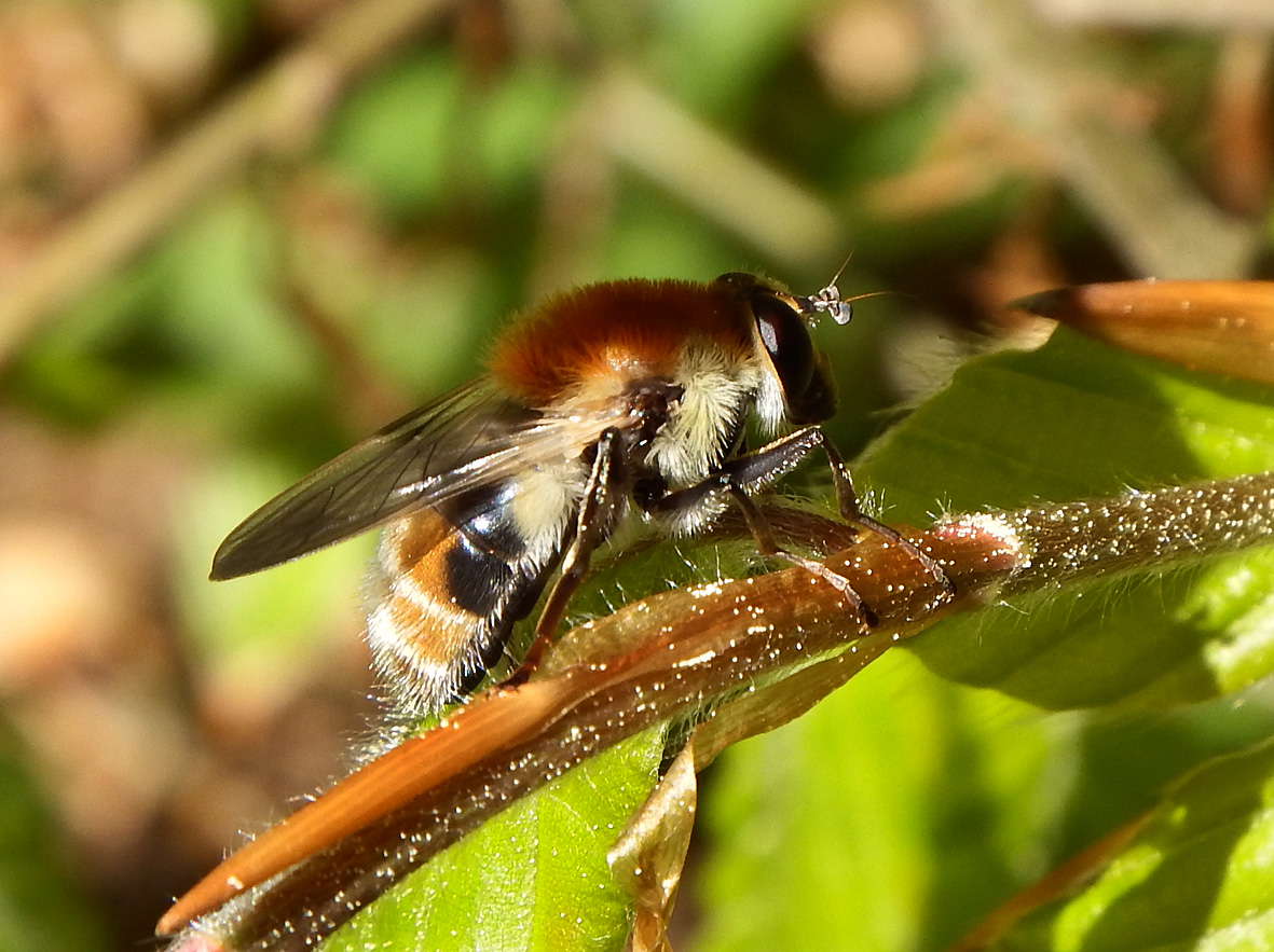 Thorax: Orangebraun behaart, lateral helle Haarbüschel; Flügelzelle m liegt offen am Flügelrand an.