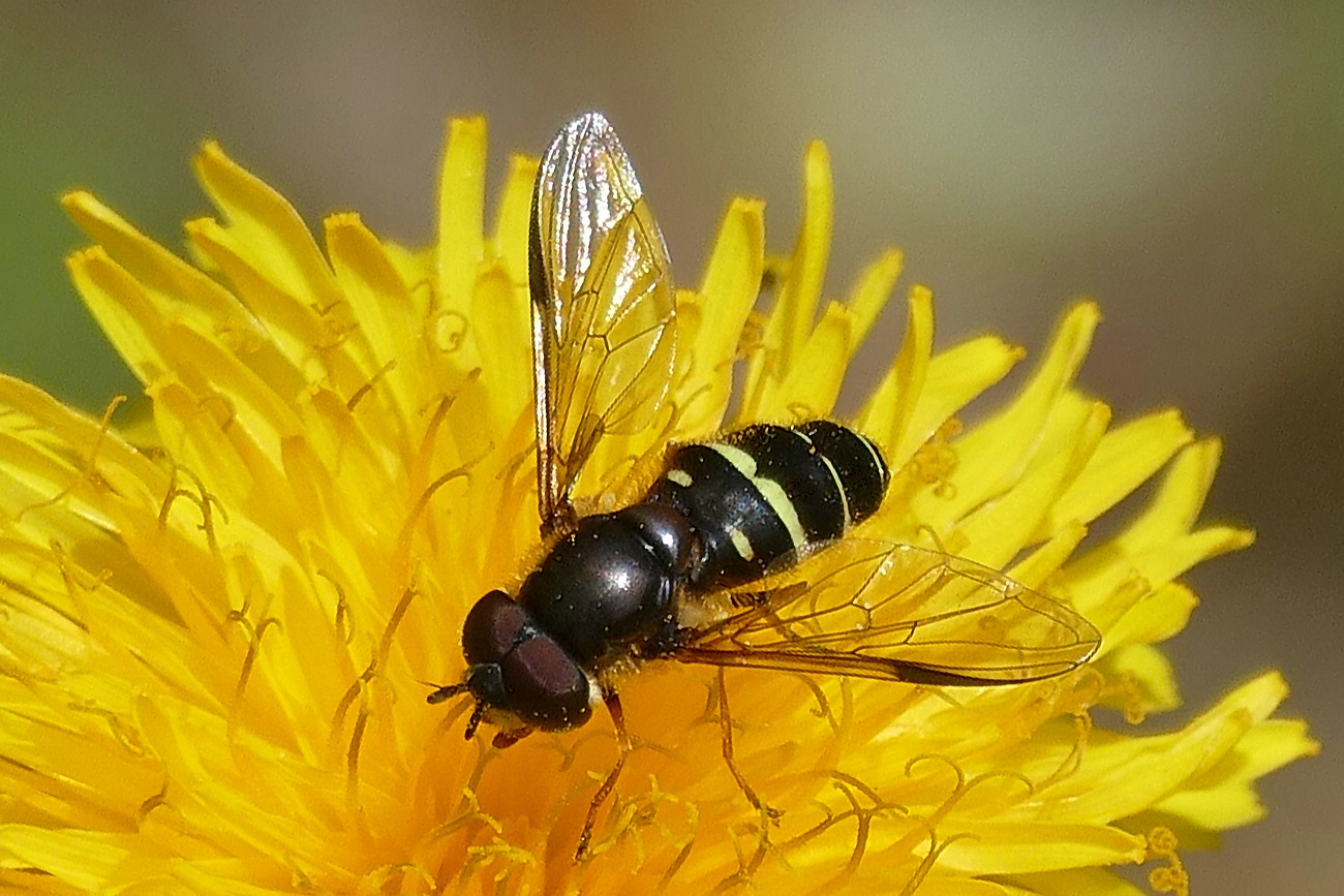 Hinterleib: Schwarz, mit drei gelben Binden am Vorderrand der Segmente 3, 4 und 5. Binde auf dem dritten Segment deutlich breiter als die anderen. Zweites Segment mit zwei kleinen gelben Punkten oder vollständig schwarz.