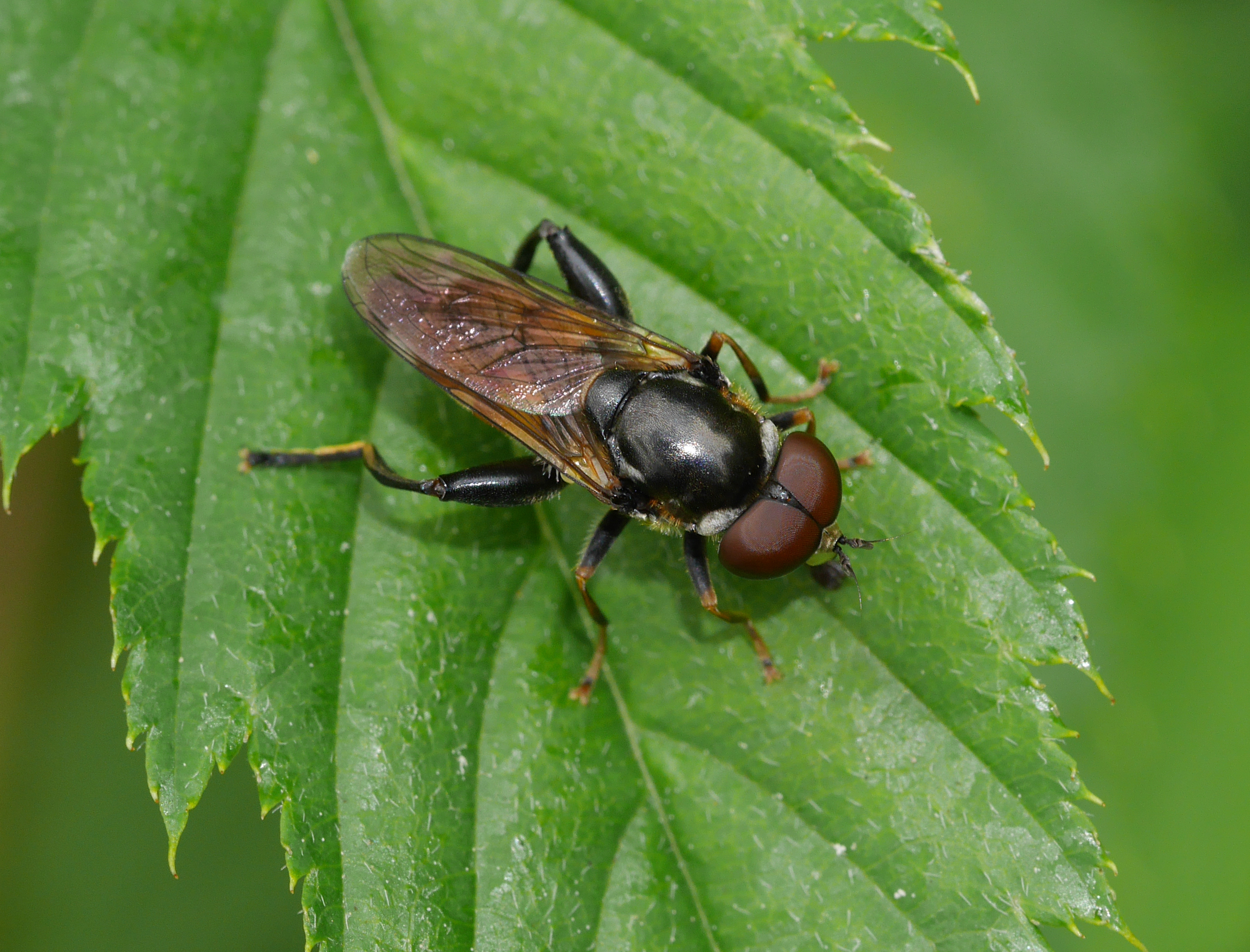 Thorax: Schwarz mit silber bestäubten Schultern. Flügelvene R4+5 schwach gebogen; Hintertibia auf der Unterseite mit deutlichem, breitem Zahn.