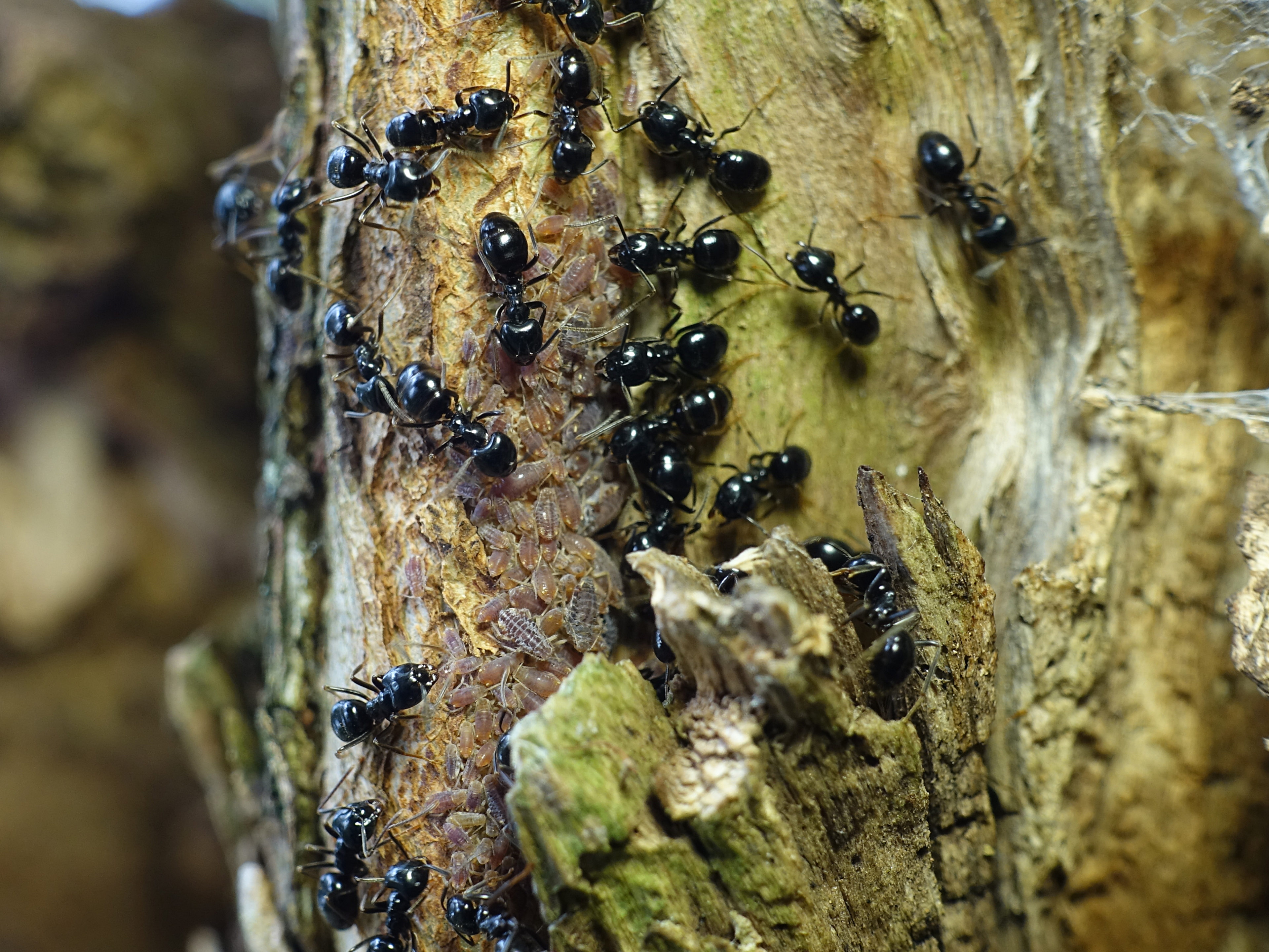 Eine besonders enge Bindung besteht zu der Blattlaus Stomaphis quercus, deren Eier von der Glänzendschwarzen Holzameise in unterirdischen Kammern am Stammfuß überwintert und die jungen Fundatrices im April in die Baumkronen verbracht werden (Seifert 2007).