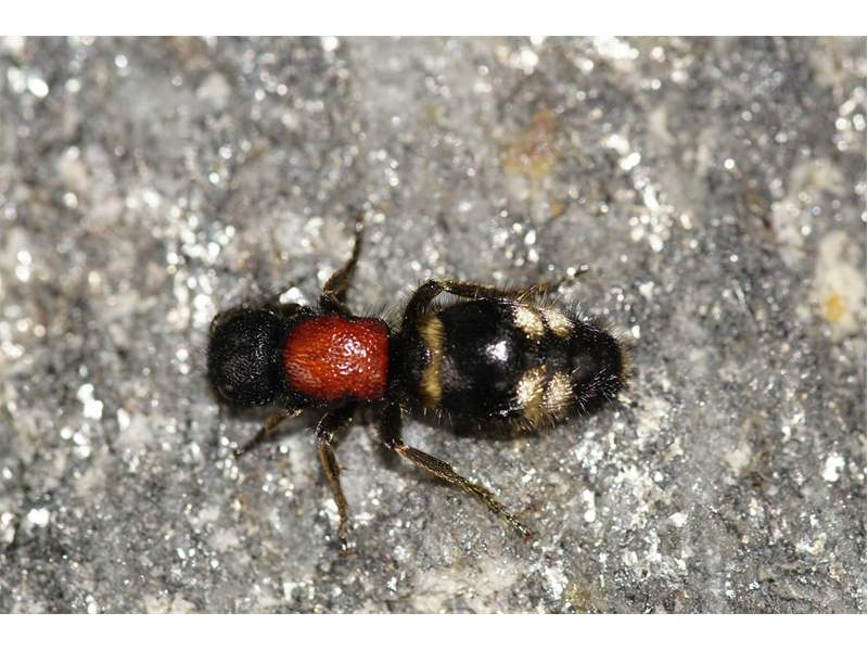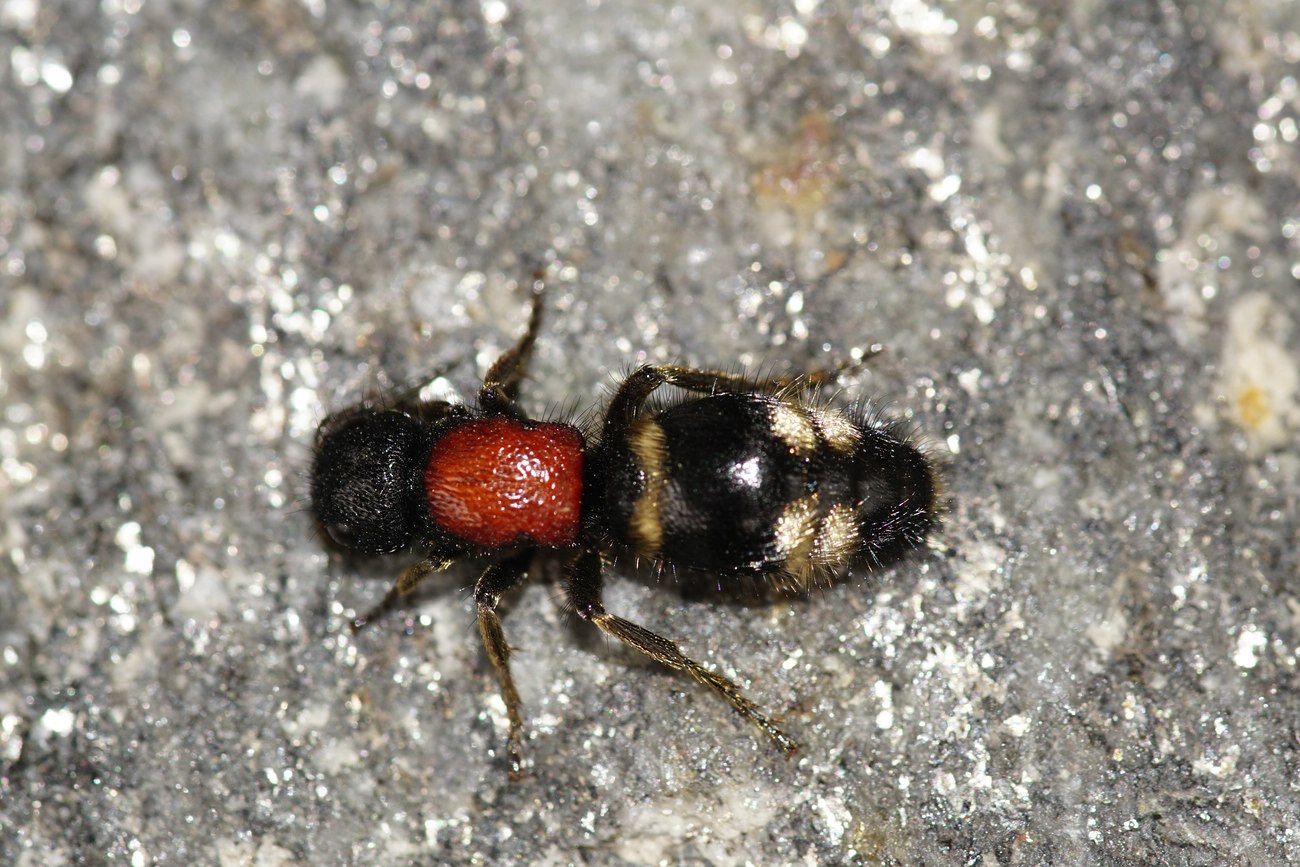 Kopf schwarz. Thorax rotbraun, selten schwarz gefärbt. Männchen geflügelt, Weibchen ungeflügelt; Beine schwarz behaart. Metasoma schwarz, anterior 1 Tergit weiß behaart, mittig 2 Tergite seitlich weißlich behaart.