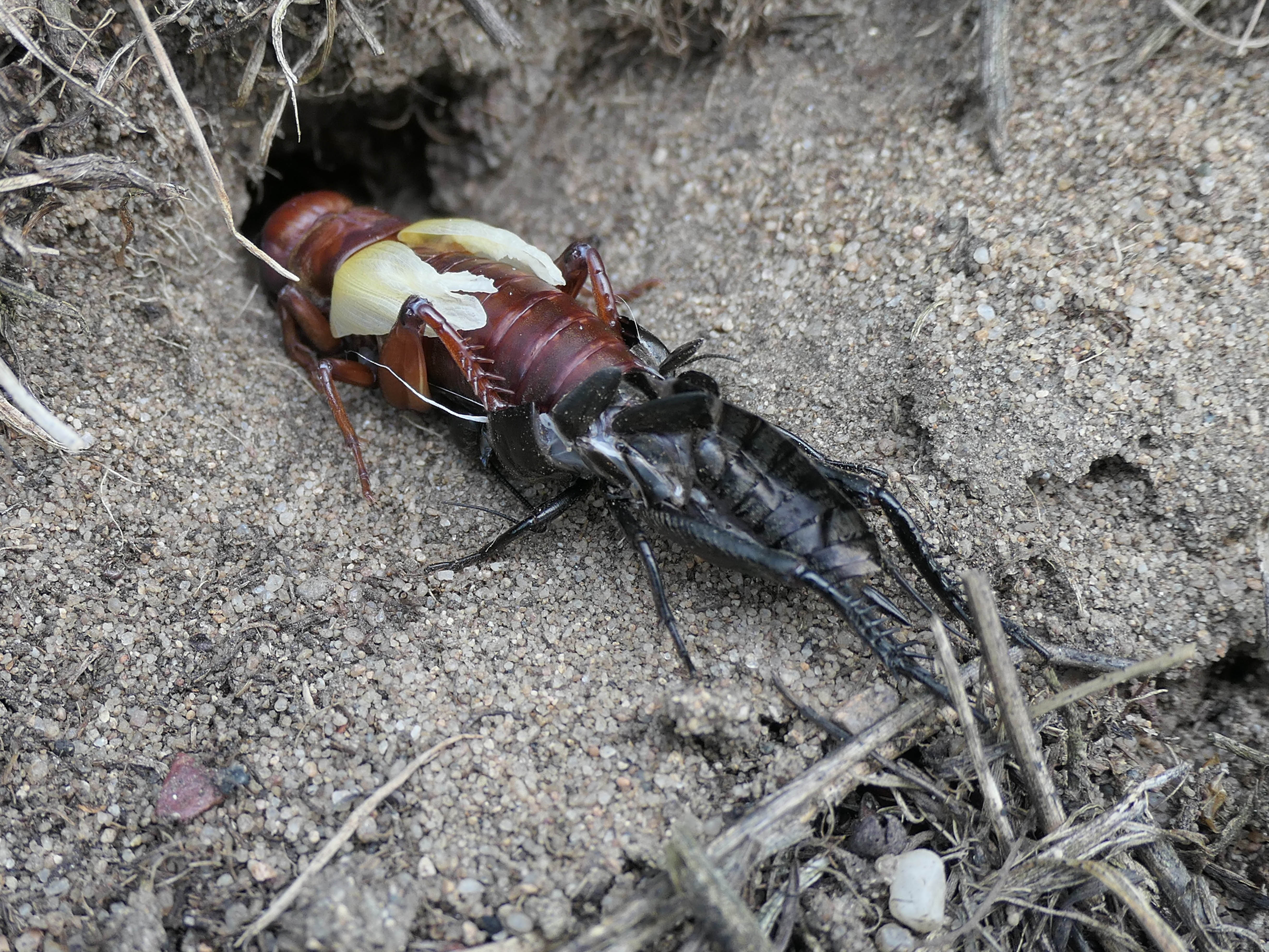 Eine Larve der Feldgrille bei der Häutung zum adulten Weibchen. Radebeul, 25.04.2021 (© Detlev Herr)( Bild vergrößern)