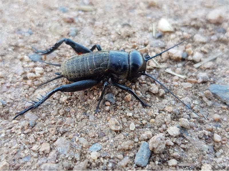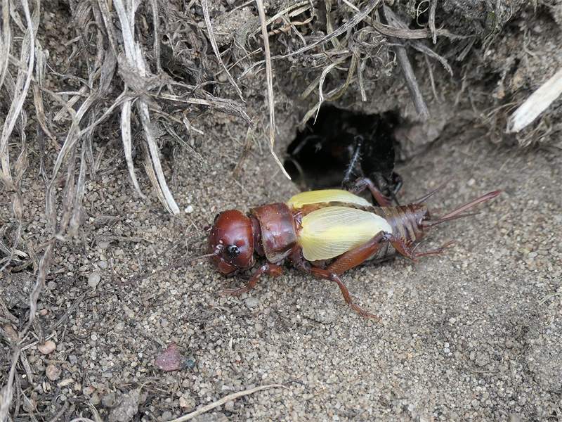 Weibliche Feldgrille in der Tagebaufolgelandschaft bei Nochten am 26.06.2005. Das Geschlecht ist an den Flügelstrukturen gut zu erkennen (regelmäßige Aderung).